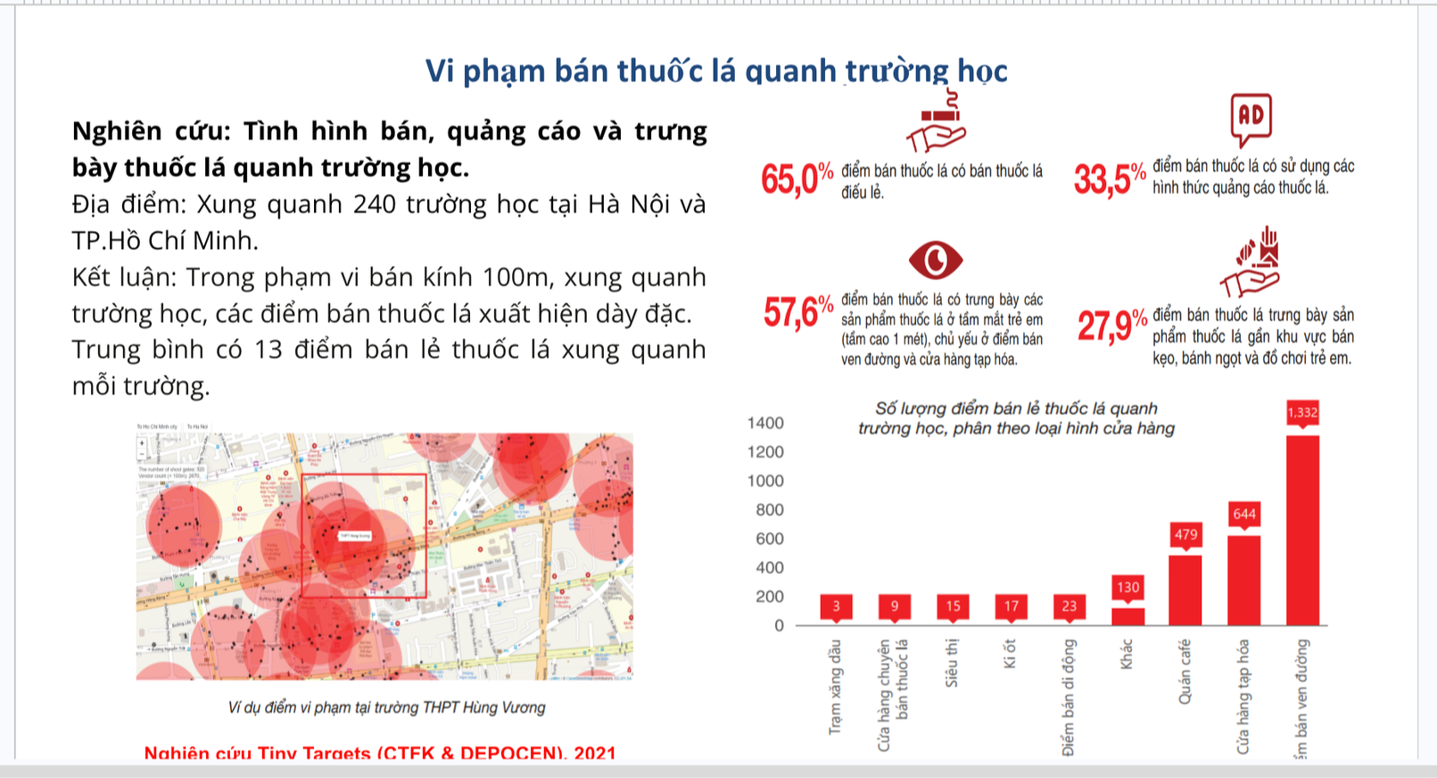 Một nghiên cứu thực hiện tại 240 trường học ở Hà Nội và TP.HCM cho thấy, trong bán kính 100m xung quanh trường, trung bình có tới 13 điểm bán thuốc lá. Đáng chú ý, có tới 65% điểm bán vẫn bán thuốc lá điếu lẻ – hình thức bị cấm theo quy định.