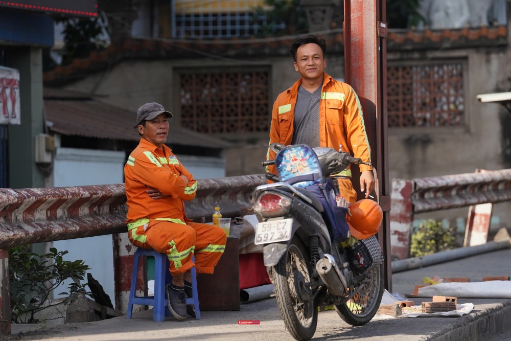 Hai nhân viên túc trực tại chân cầu đảm nhiệm việc nhắc nhở, điều hướng xe tải không được phép lưu thông, tránh việc tài xế đi nhầm hướng.
