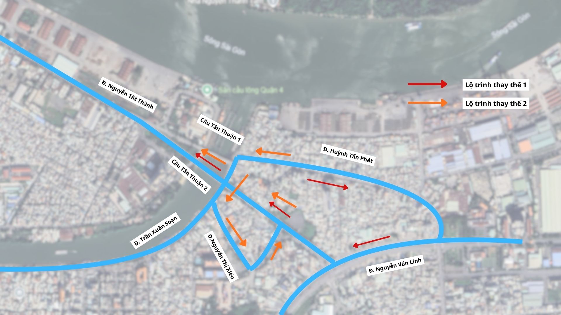 Lộ trình thay thế cho xe bị cấm: Lộ trình 1: Huỳnh Tấn Phát Nguyễn Văn Linh cầu Tân Thuận 2 Nguyễn Tất Thành. Lộ trình 2: Huỳnh Tấn Phát Trần Xuân Soạn Nguyễn Thị Xiếu cầu Tân Thuận 2 Nguyễn Tất Thành.