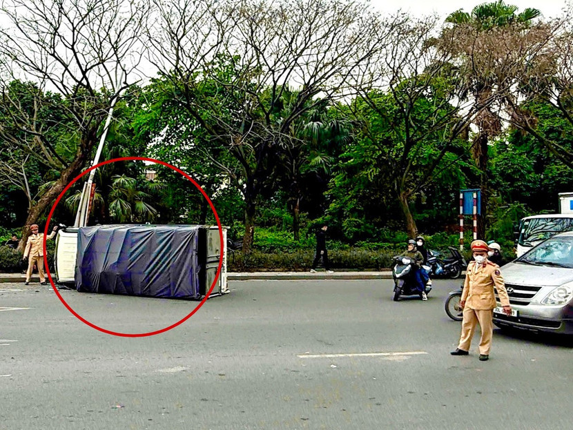 Khi đến gần khu vực ngã ba Đàm Quang Trung - sân Golf Long Biên, phương tiện bất ngờ có dấu hiệu mất lái, va vào cột biển báo giao thông và đổ nghiêng ra đường. Qua hình ảnh camera có thể xác định trước và sau thời điểm va chạm, xe tải không xảy ra va chạm với phương tiện nào khác.