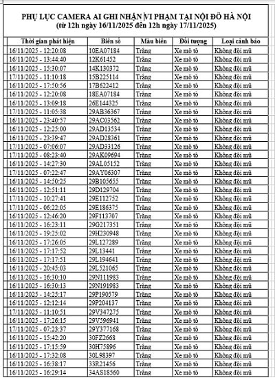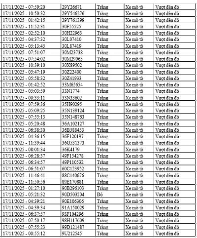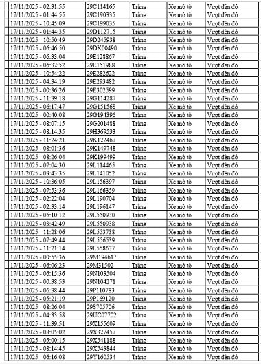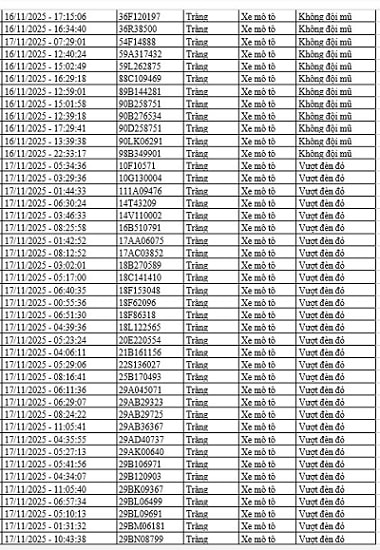 50 trường hợp người điều khiển xe máy không đội mũ bảo hiểm. Nhiều trường hợp xe máy vượt đèn đỏ. Danh sách như sau: