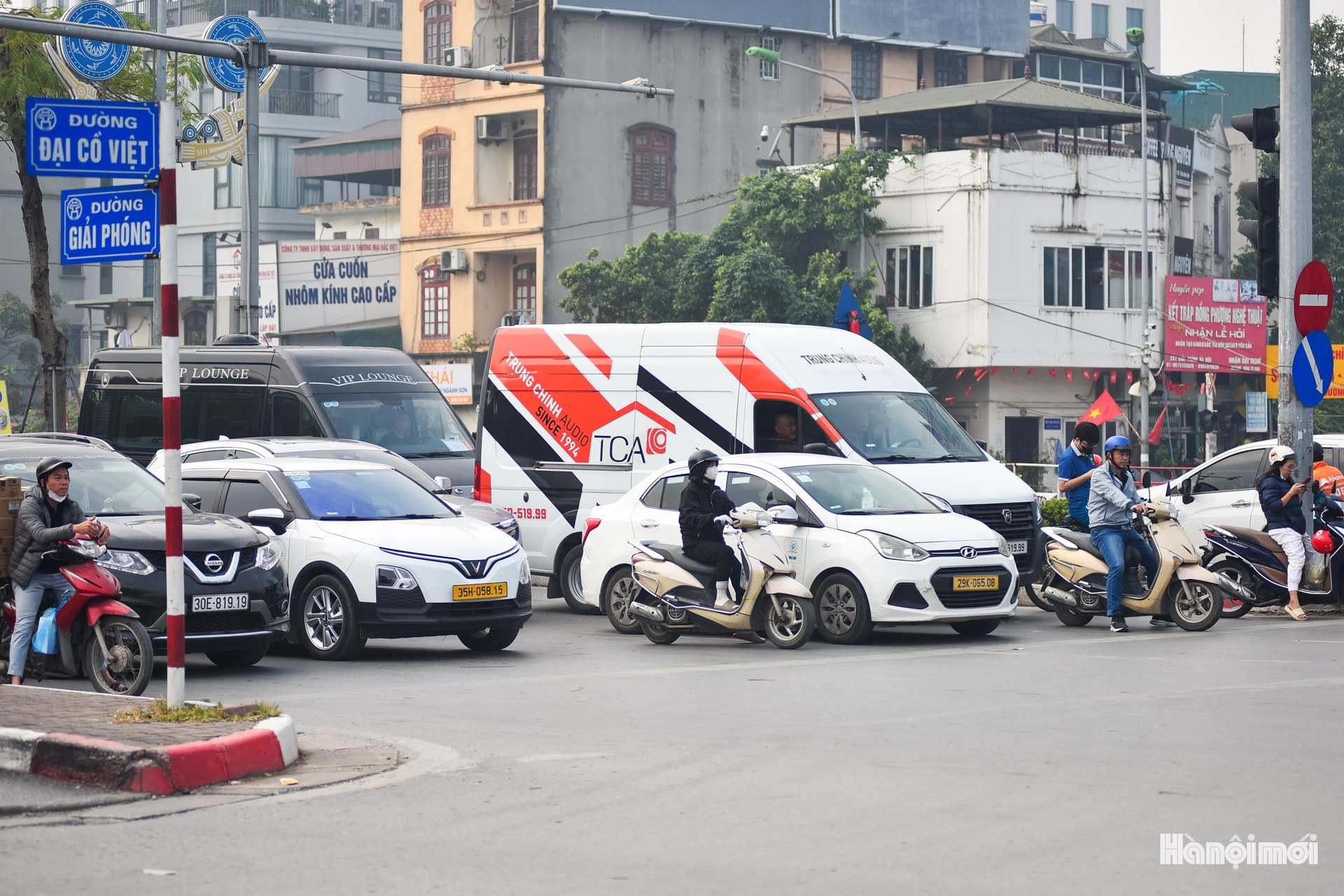 Điểm nóng thường xuyên ùn ứ như ngã tư Giải Phóng - Đại Cồ Việt ghi nhận cảnh phương tiện xếp thẳng hàng, đúng vạch chờ đèn đỏ.