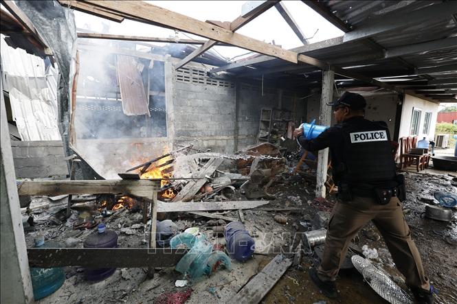 Một ngôi nhà ở tỉnh Surin, Thái Lan bị phá hủy do trúng đạn pháo trong xung đột biên giới với Campuchia, ngày 11/12/2025. Ảnh: THX/TTXVN
