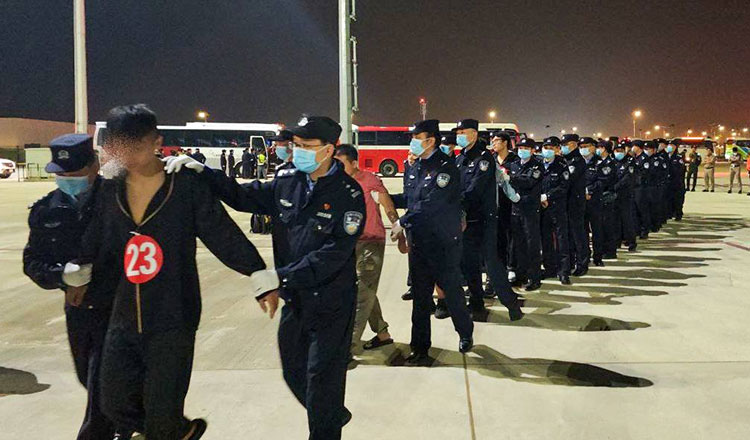 Cảnh sát Campuchia áp giải tội phạm người Trung Quốc chuẩn bị trục xuất về nước. Ảnh: KHMER TIMES