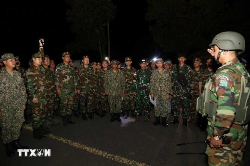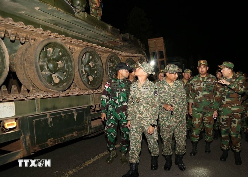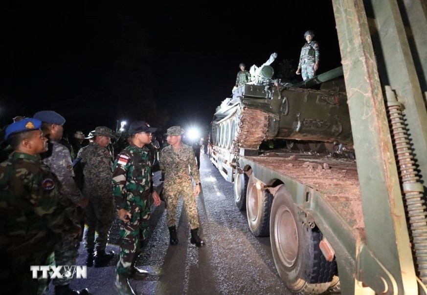 Các quan sát viên ASEAN giám sát hoạt động rút khí tài quân sự, vũ khí hạng nặng của Quân đội Campuchia khỏi khu vực biên giới tranh chấp. (Nguồn: AKP/TTXVN phát)