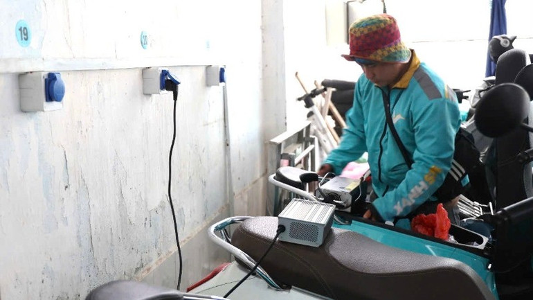 Một điểm cung cấp dịch vụ sạc điện cho xe máy. (Ảnh: THẾ ANH)