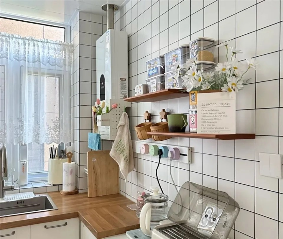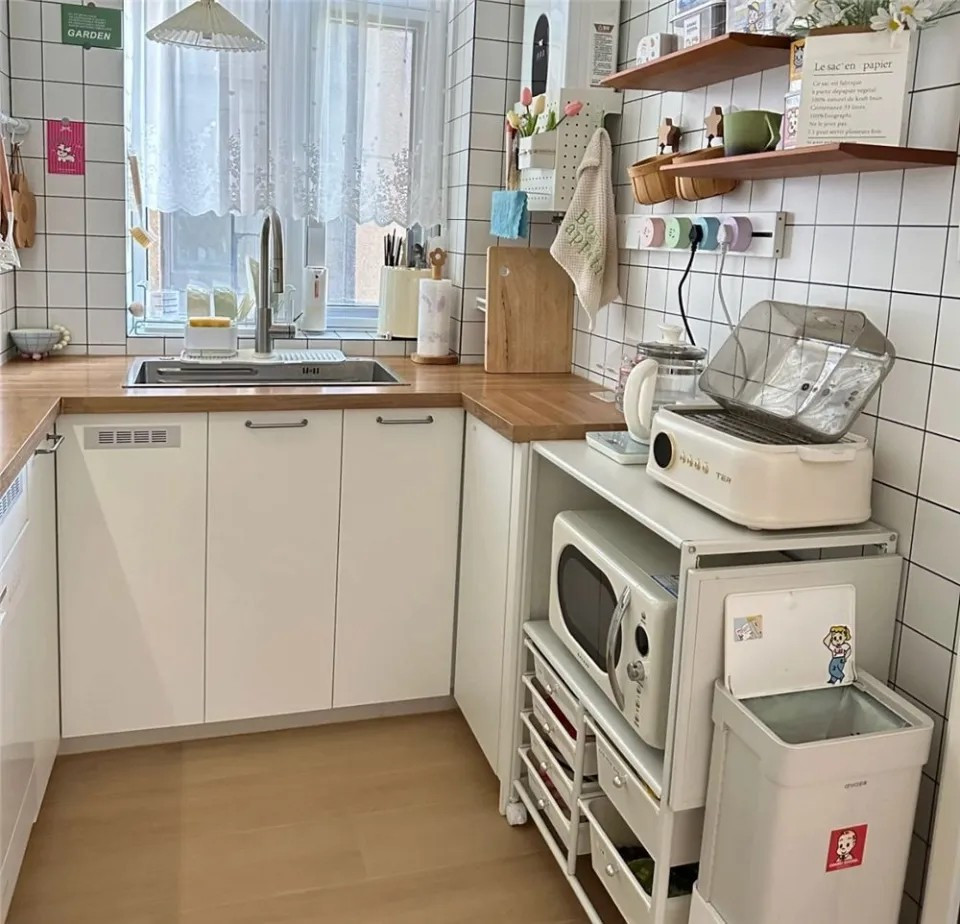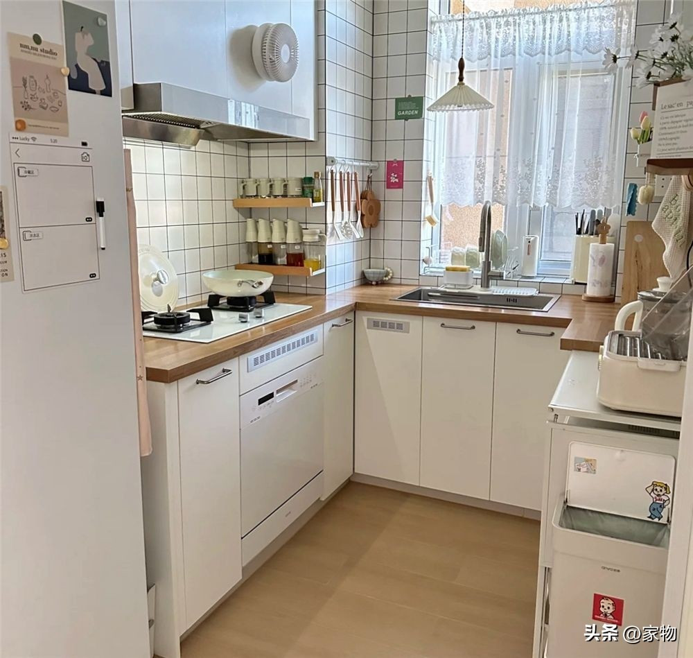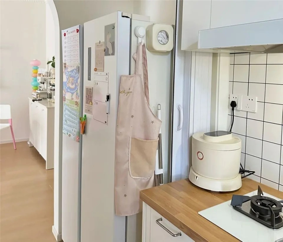 Khu bếp nhỏ xinh nhưng đầy đủ chức năng, được bố trí theo hình chữ U. Thay vì để tủ lạnh trong bếp chật, cô di chuyển tủ ra ngoài cửa bếp. Ảnh: QQ