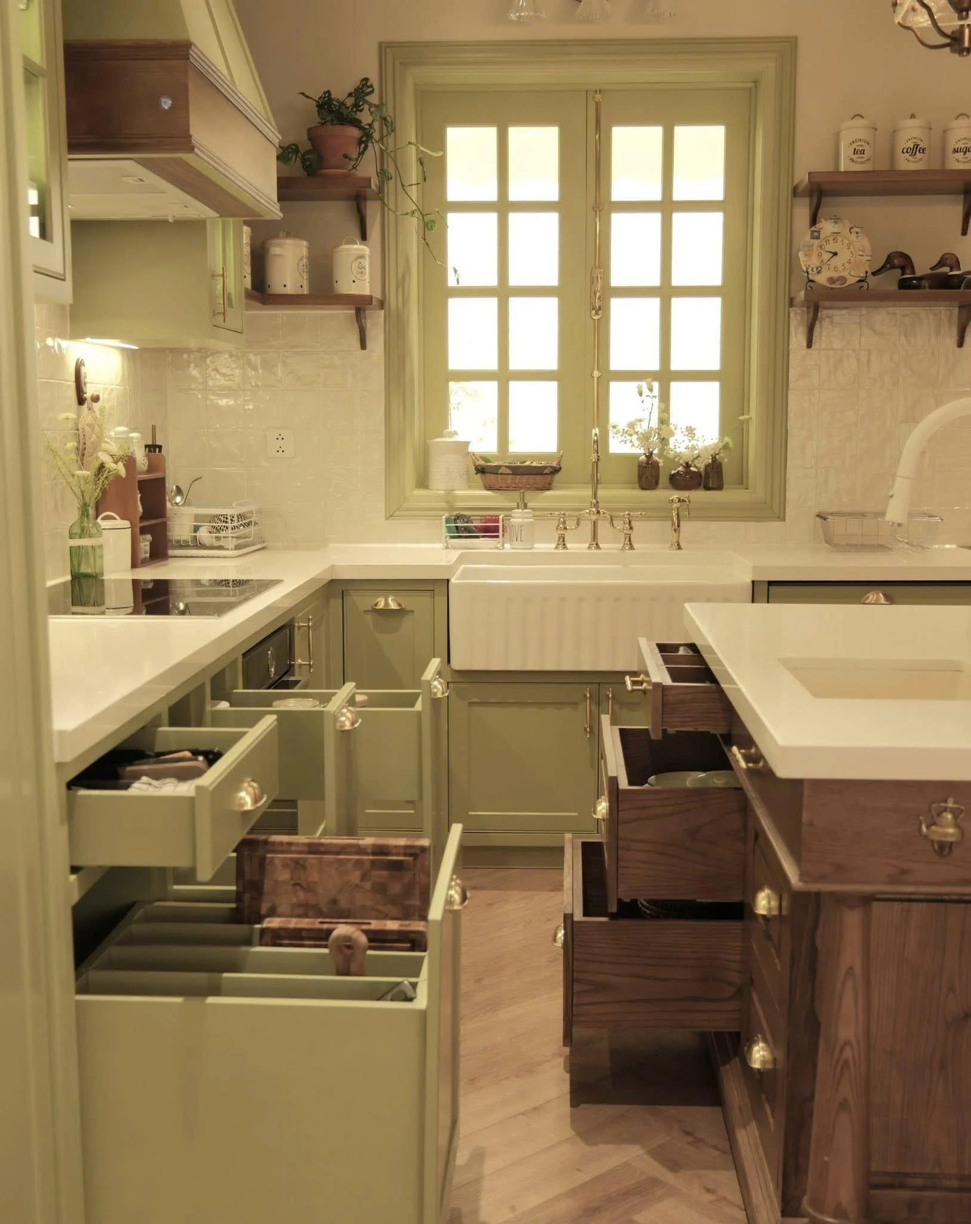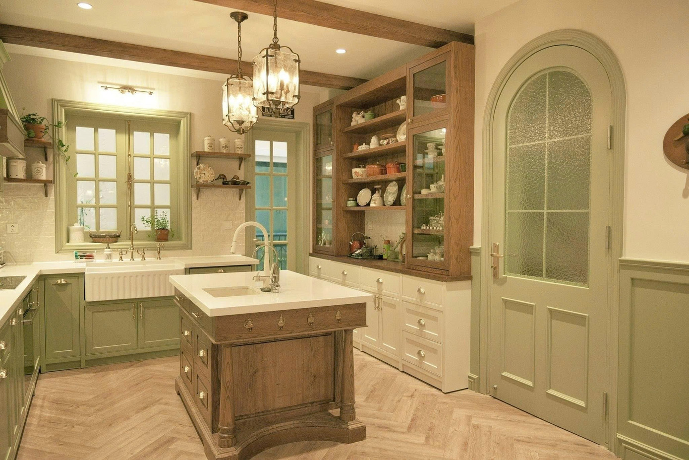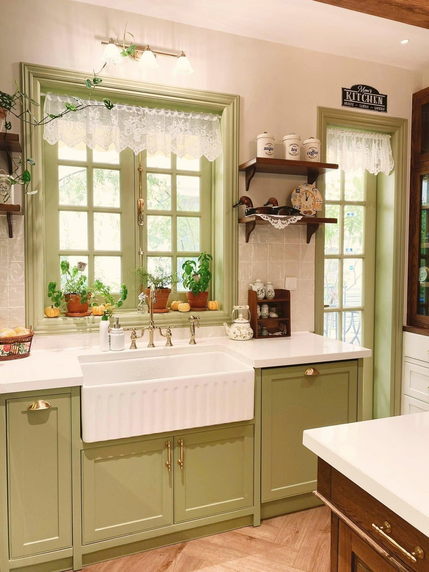 Chủ nhân căn bếp từng đi qua nhiều phong cách khác nhau, từ tối giản, hiện đại đến modern farmhouse, trước khi dừng lại ở cottagecore – phong cách đề cao sự mộc mạc, gần gũi với thiên nhiên và gợi nhớ nhịp sống chậm. Tông xanh bơ dịu nhẹ phủ lên không gian bếp như một lớp nền cảm xúc, kết hợp cùng hệ tủ gỗ màu hạt dẻ tạo nên tổng thể ấm cúng, vintage nhưng không hoài cổ nặng nề. Đó là sự hoài niệm được tiết chế, vừa đủ để mang lại cảm giác thân thuộc.
