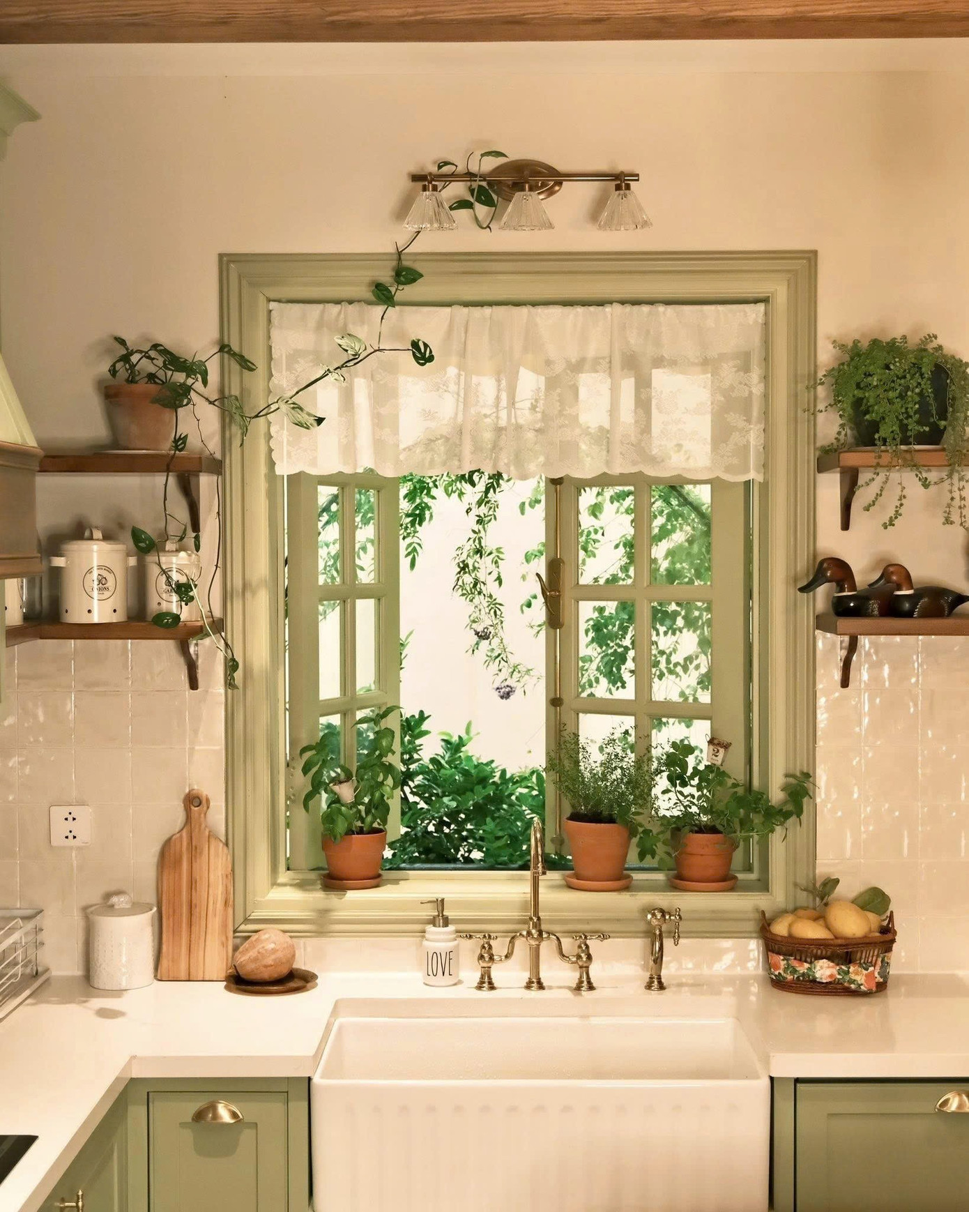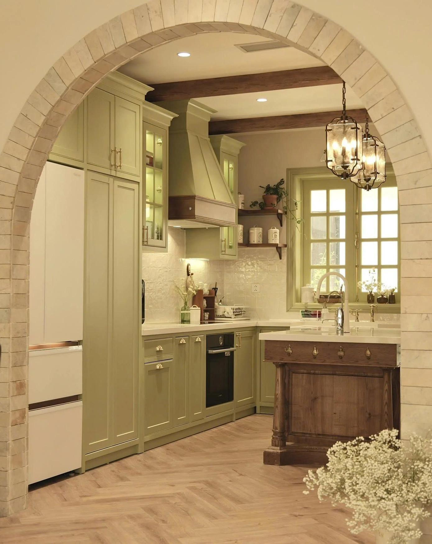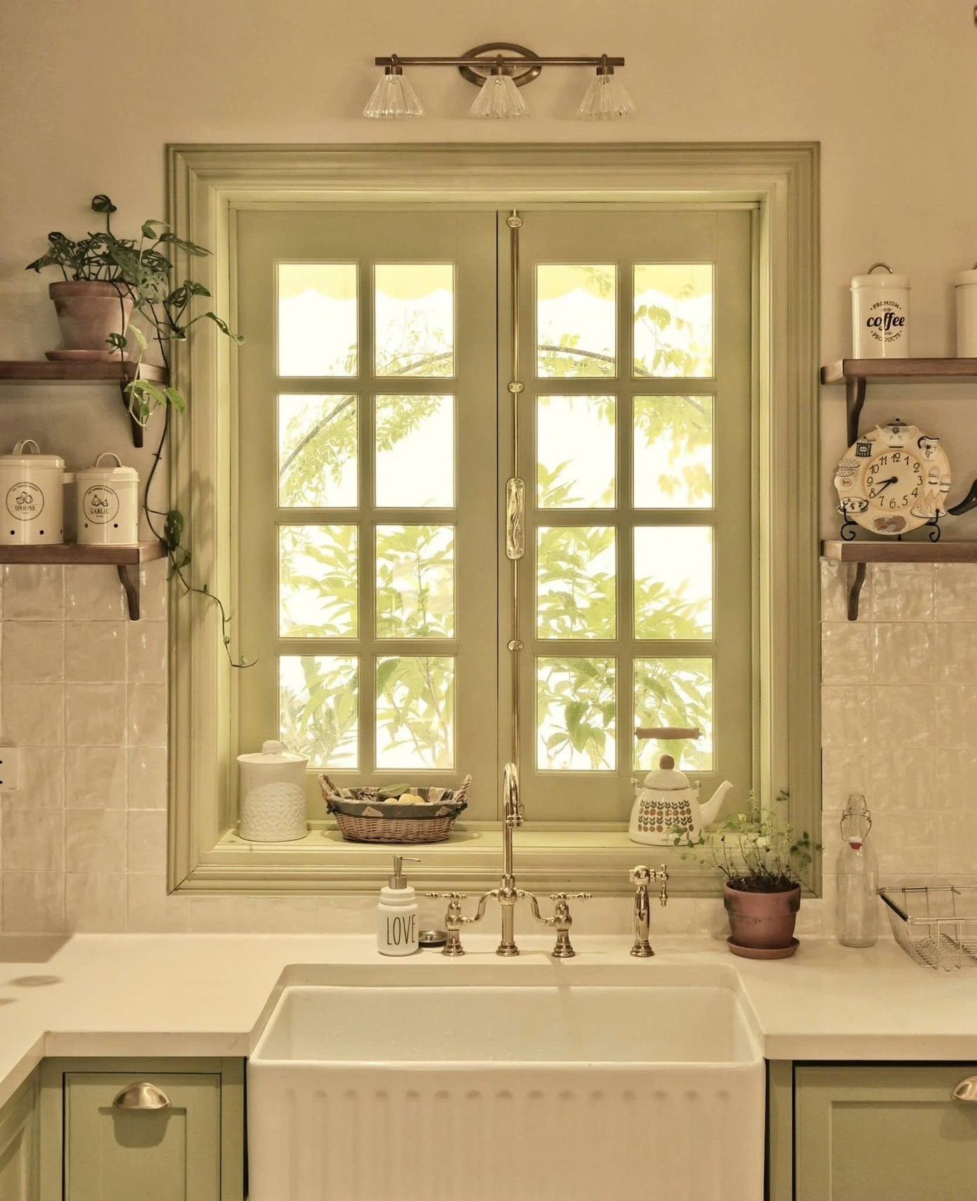 Chủ nhân căn bếp từng đi qua nhiều phong cách khác nhau, từ tối giản, hiện đại đến modern farmhouse, trước khi dừng lại ở cottagecore – phong cách đề cao sự mộc mạc, gần gũi với thiên nhiên và gợi nhớ nhịp sống chậm. Tông xanh bơ dịu nhẹ phủ lên không gian bếp như một lớp nền cảm xúc, kết hợp cùng hệ tủ gỗ màu hạt dẻ tạo nên tổng thể ấm cúng, vintage nhưng không hoài cổ nặng nề. Đó là sự hoài niệm được tiết chế, vừa đủ để mang lại cảm giác thân thuộc.