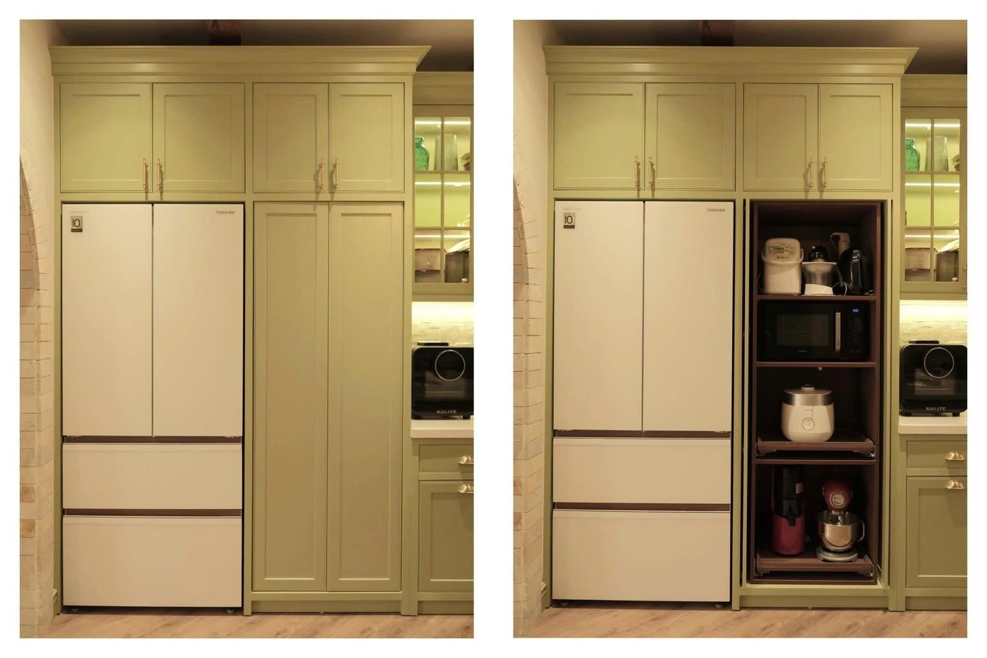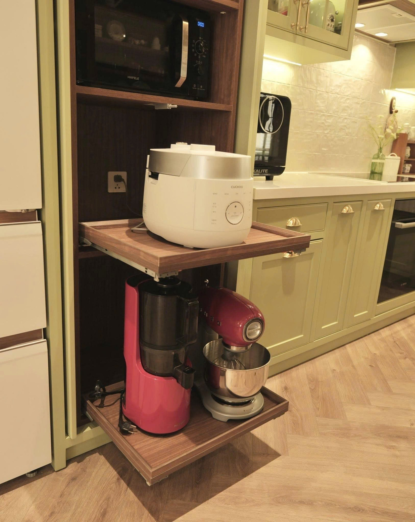 Mỗi chi tiết nhỏ trong căn bếp đều có lý do tồn tại. Khoang tủ gia dụng được thiết kế riêng với kệ trượt, cơ chế khóa chống trượt và đóng mở một tay, giúp việc sử dụng nồi cơm điện, máy trộn bột hay máy ép chậm trở nên thuận tiện và an toàn. Hệ máy hút mùi âm tủ công suất lớn giữ cho khu nấu nướng luôn thông thoáng, trong khi máy rửa bát âm toàn phần giúp không gian gọn gàng mà vẫn đảm bảo tiện nghi.