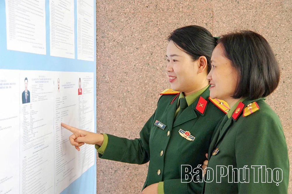 Cán bộ, chiến sĩ Ban Chỉ huy PTKV2 - Thống Nhất tìm hiểu tiểu sử người ứng cử để gửi gắm niềm tin vào người đại biểu dân cử.