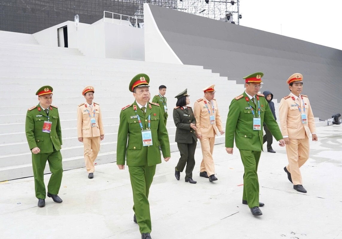 Lãnh đạo Công an thành phố Hà Nội kiểm tra việc triển khai phương án bảo đảm an ninh, an toàn Chương trình nghệ thuật đặc biệt chào mừng thành công Đại hội XIV. Ảnh: GV
