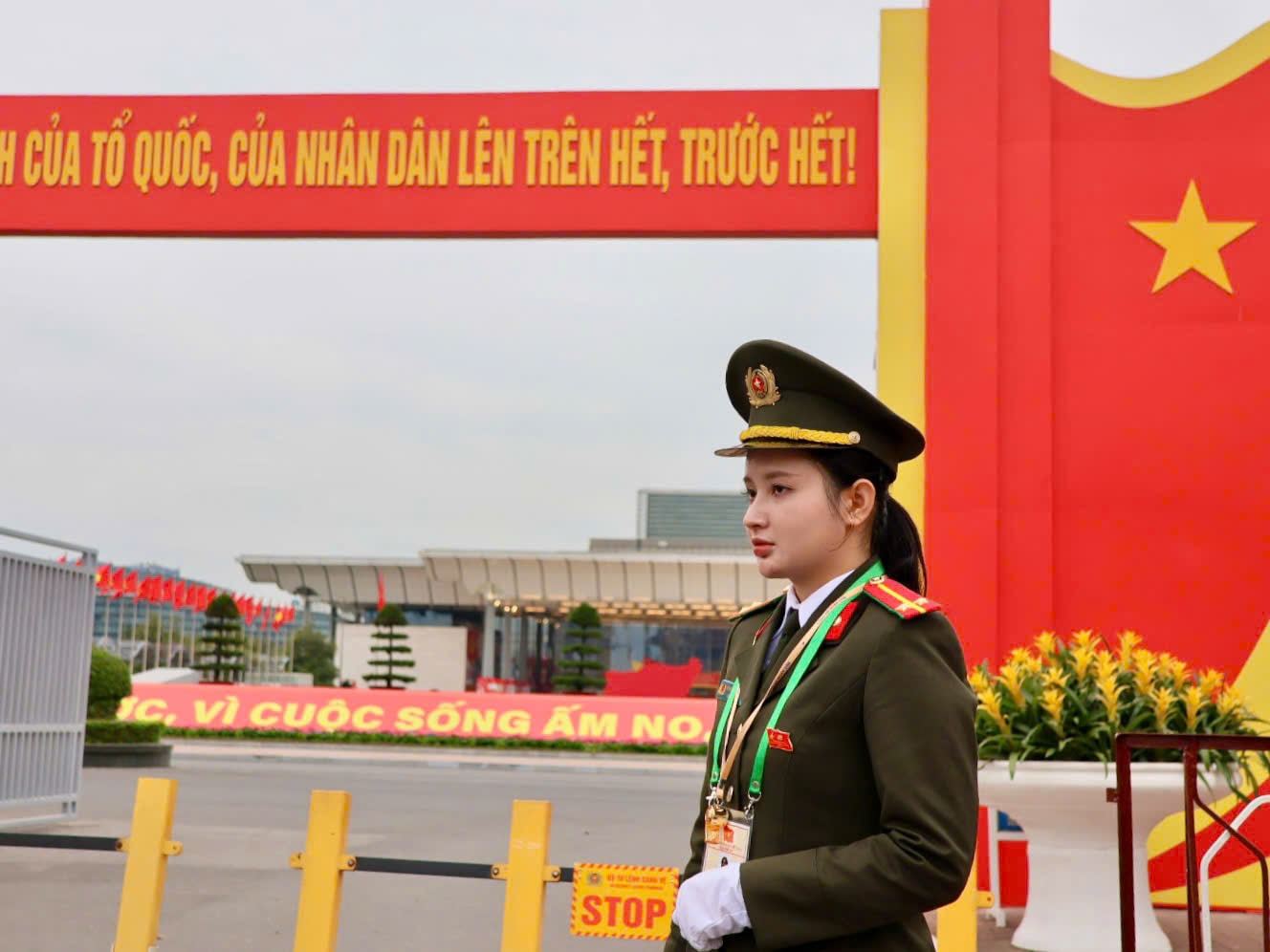 Nữ chiến sĩ Công an thành phố Hà Nội làm nhiệm vụ tại cổng Trung tâm hội nghị Quốc gia. Ảnh: NT