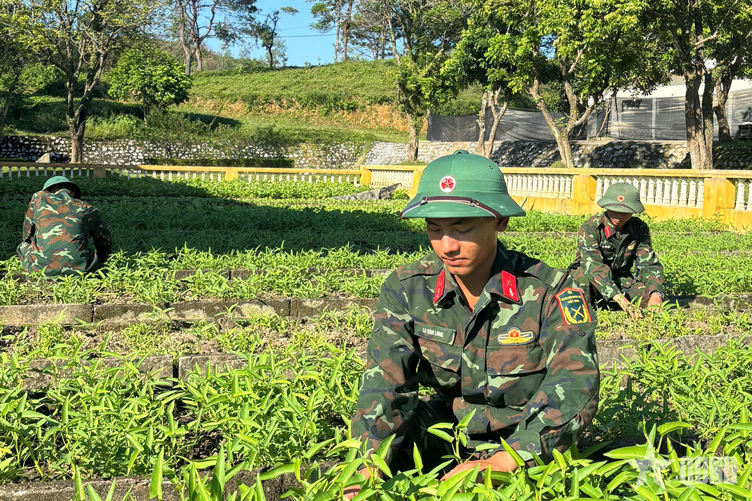 Binh nhất La Văn Long, chiến sĩ Đại đội Đảo Vĩnh Thực cùng đồng đội đẩy mạnh tăng gia, chăm sóc vườn rau xanh của đơn vị.