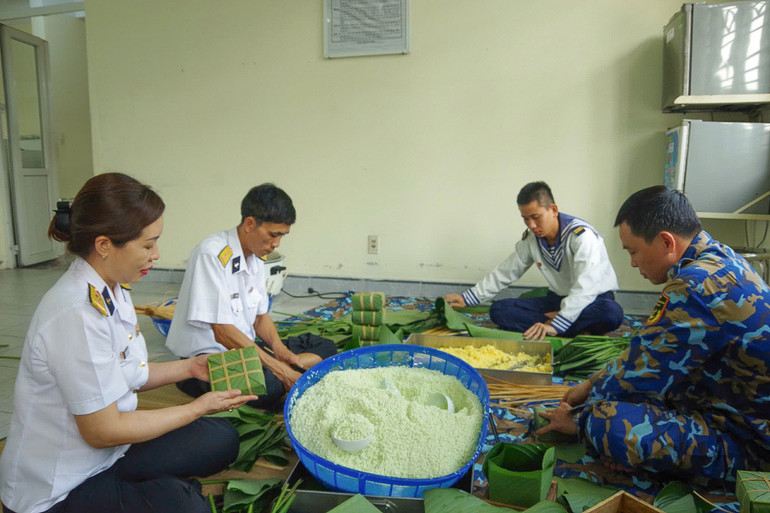 Trong khuôn viên đơn vị, sắc xuân hiện diện qua những chậu mai vàng, cành đào thắm, những băng rôn, khẩu hiệu mừng Đảng, mừng Xuân được trang trí trang trọng. Hoạt động gói bánh chưng xanh trở thành nét đẹp truyền thống mỗi dịp Tết đến. Bên nồi bánh đỏ lửa, tiếng cười nói rộn ràng, những bàn tay quen sóng gió khéo léo gói từng chiếc bánh vuông vức. Mỗi chiếc bánh không chỉ mang hương vị Tết quê hương mà còn gửi gắm tình đồng chí, đồng đội nơi đầu sóng.