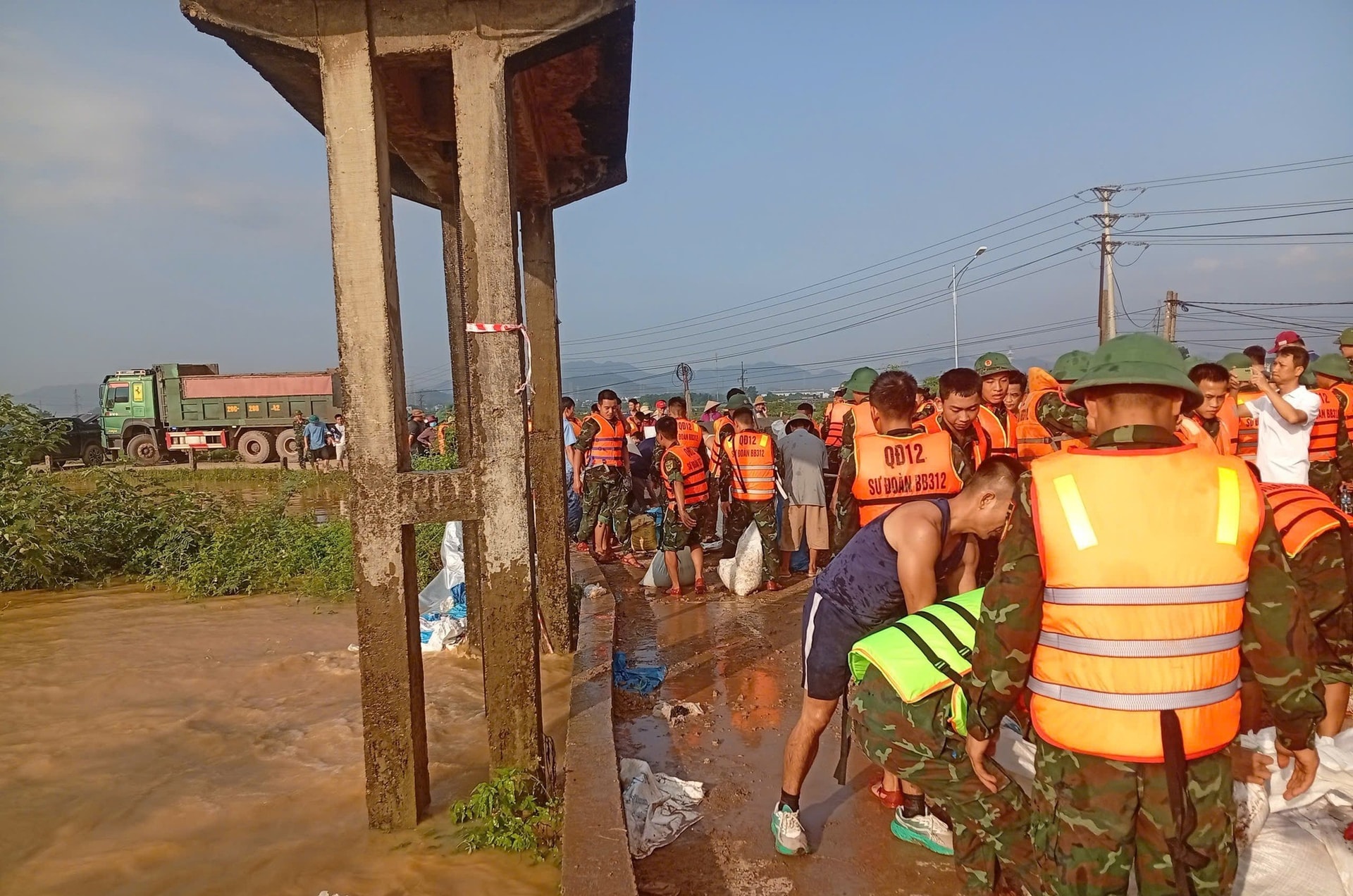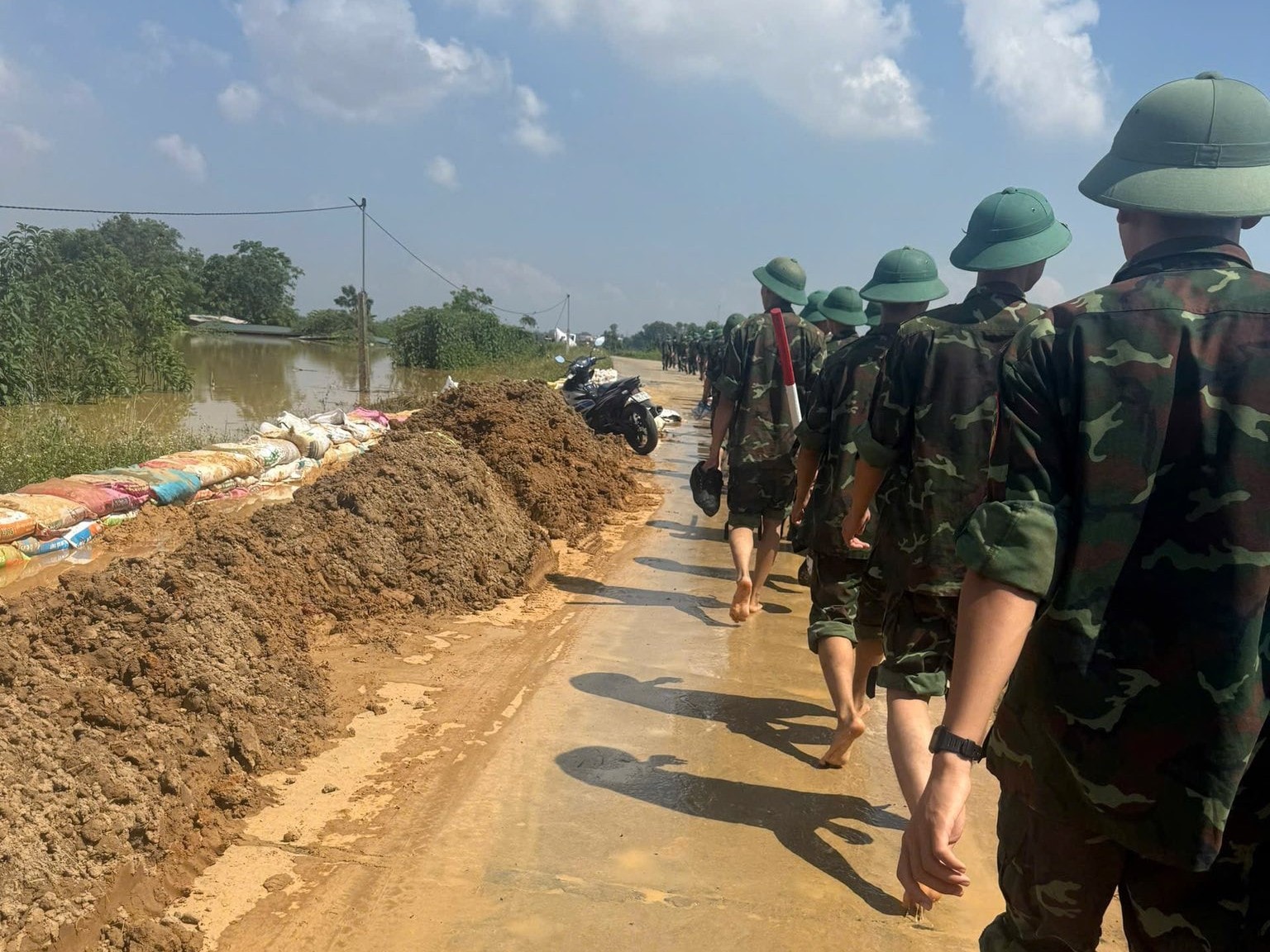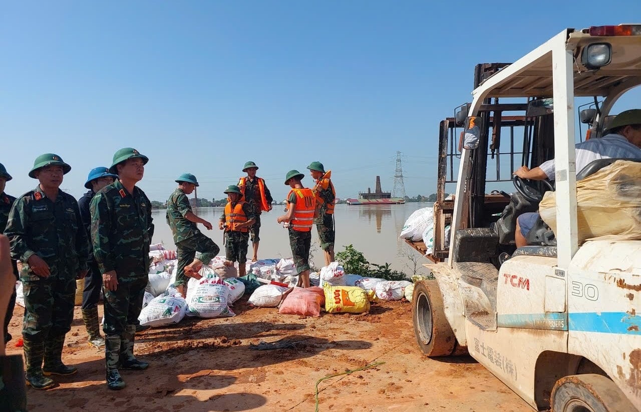 Cán bộ, chiến sĩ Trung đoàn 141 (Sư đoàn 3, Quân khu 1) khẩn trương hộ đê giúp dân. Ảnh: Hoàng Hưng