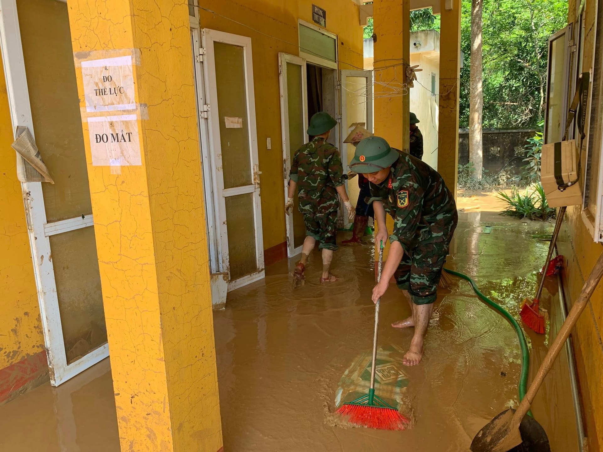 Sáng 9-10, cán bộ, chiến sĩ Lữ đoàn Công binh 575 đã nhanh chóng cơ động đến địa bàn, phối hợp cùng lực lượng địa phương thu dọn bùn đất, san gạt mặt bằng, khơi thông dòng chảy, giúp trạm y tế sớm ổn định hoạt động khám chữa bệnh cho nhân dân xã Dân Tiến tỉnh Thái Nguyên. Ảnh: Hoàng Tiến Thảo