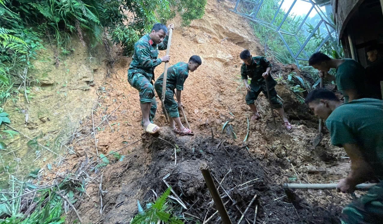 Cán bộ, chiến sĩ Trung đoàn 141 (Sư đoàn 3, Quân khu 1) đã cơ động lực lượng đến các xã Xuân Cẩm, Hợp Thịnh (tỉnh Bắc Ninh), phối hợp cùng cấp ủy, chính quyền và nhân dân địa phương khắc phục hậu quả do bão số 11 gây ra. Ảnh: Hoàng Hưng