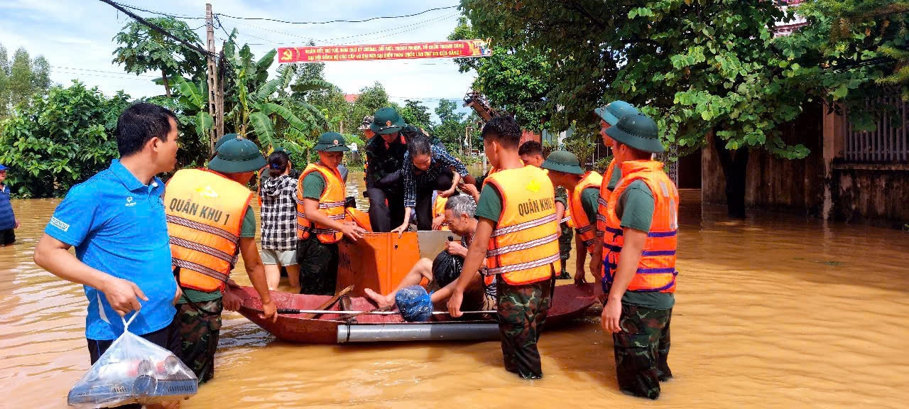 Cán bộ, chiến sĩ Bộ Chỉ huy Quân sự tỉnh Thái Nguyên cấp cứu người dân trong vùng lũ. Ảnh: Nguyễn Văn Dương