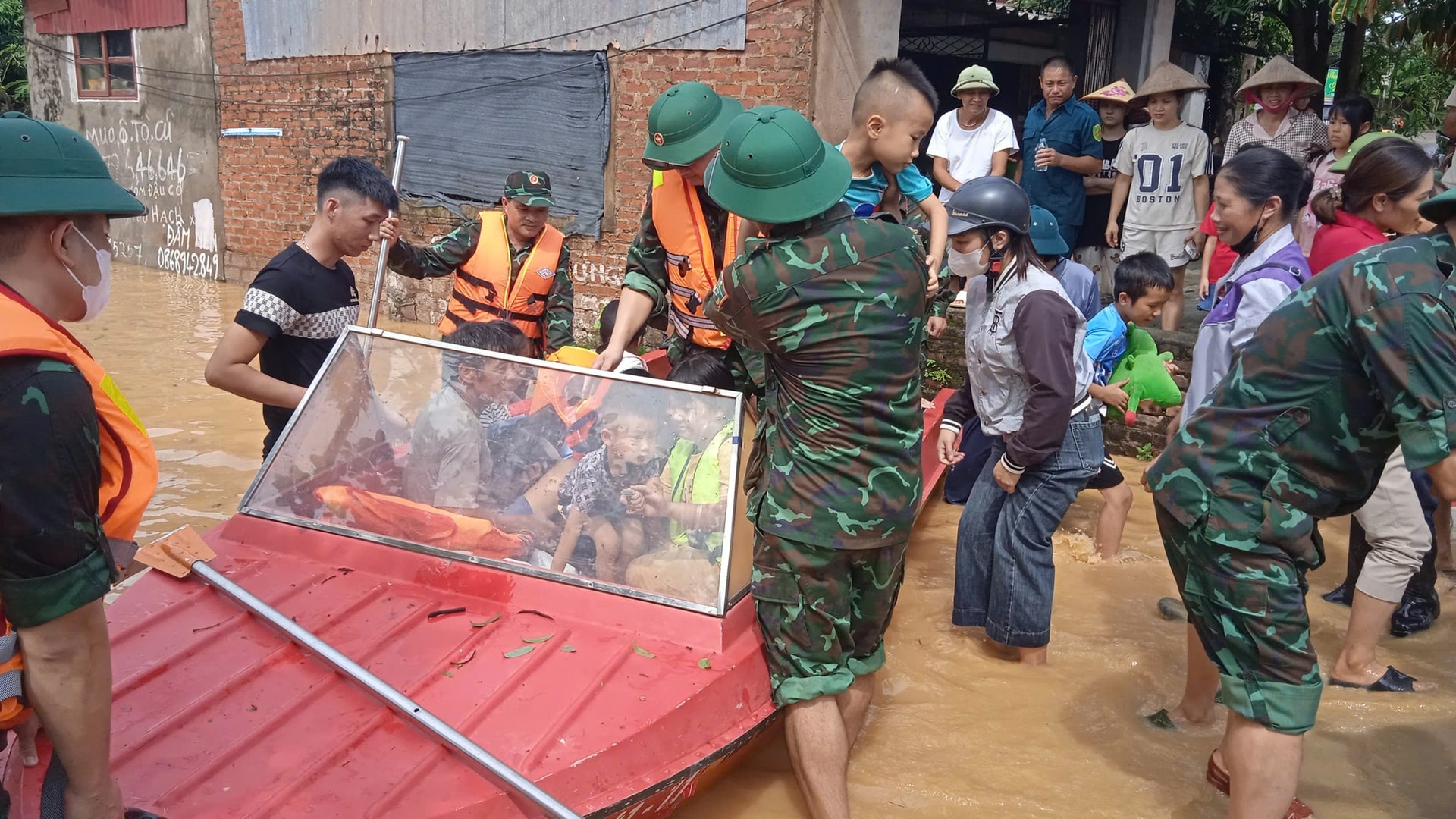 Ban Chỉ huy Phòng thủ khu vực 2 - Lạng Giang, tỉnh Bắc Ninh khẩn trương huy động lực lượng cùng phương tiện chuyên dụng, sử dụng xuồng máy cứu hộ phối hợp với chính quyền địa phương tổ chức di chuyển người dân, nhất là người già, phụ nữ, trẻ nhỏ ra khỏi khu vực nguy hiểm đến nơi an toàn. Ảnh: Gia Mạnh