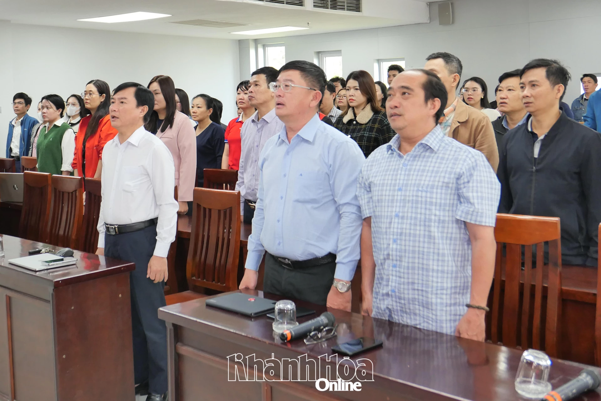 Cán bộ, đảng viên, viên chức Báo và Phát thanh, Truyền hình Khánh Hòa xem truyền hình trực tiếp lễ khai mạc Đại hội Đảng. Ảnh: Vương Mạnh Cường.
