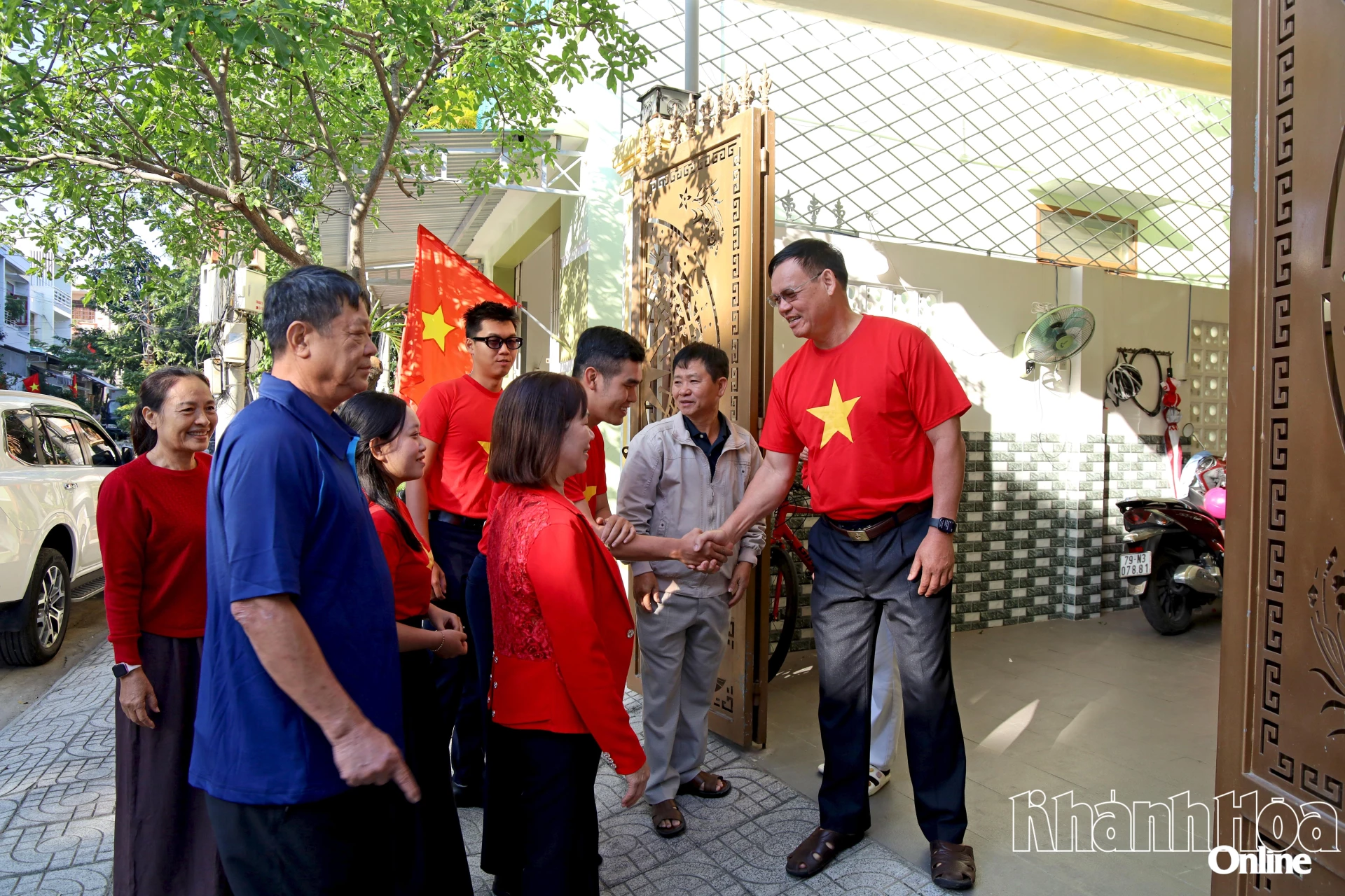 Gia đình ông Trần Văn Xô tổ dân phố 1 Phước Thành (phường Nam Nha Trang) vui mừng đón bà con hàng xóm tới cùng xem chương trình khai mạc Đại hội. Ảnh: Tiểu Mai.
