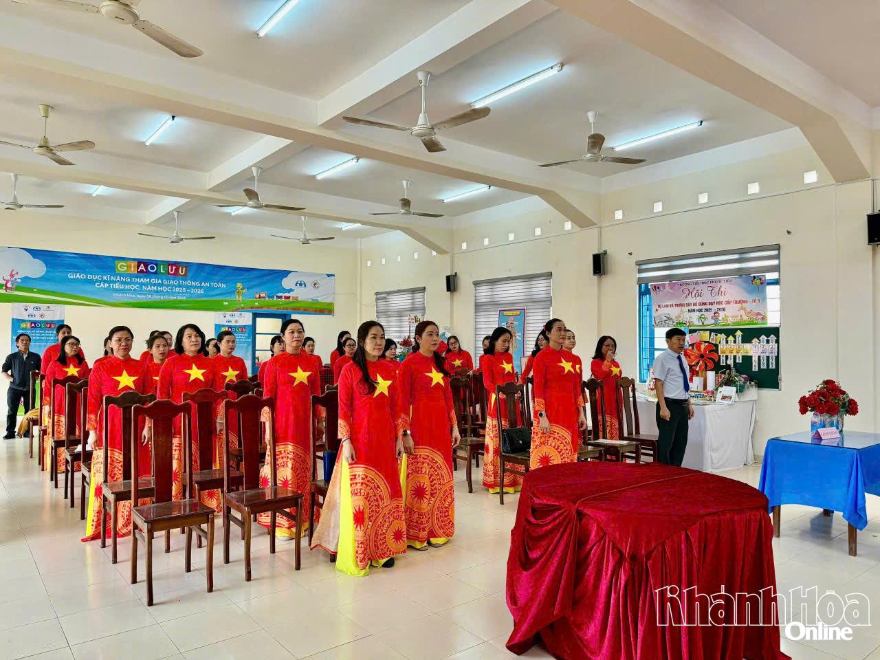 Các giáo viên Trường Tiểu học Phước Tiến thực hiện nghi thức chào cờ theo chương trình truyền hình trực tiếp của Đại hội Đảng. Ảnh: P.T