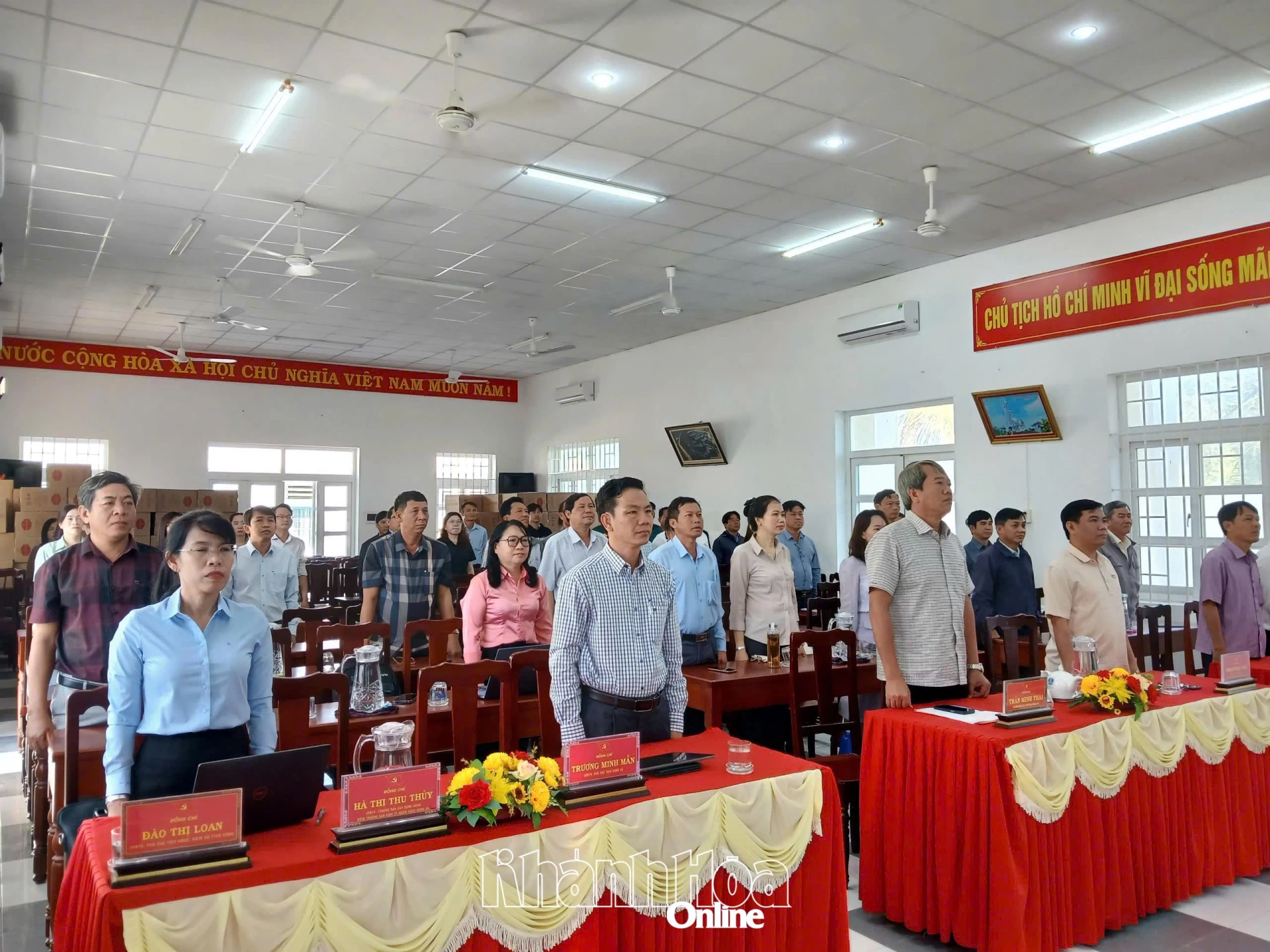 Các đảng viên, người dân phường Nam Nha Trang trang nghiêm hướng về màn hình cùng hát Quốc ca. Ảnh: Tiểu Mai