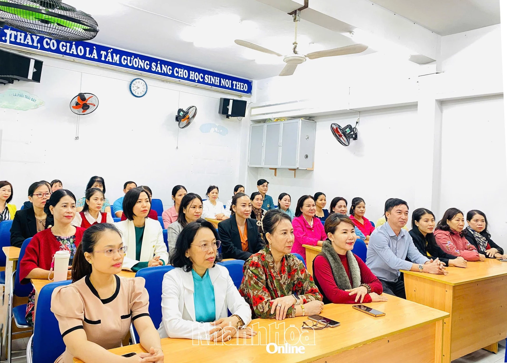 Giáo viên Trường Tiểu học Vĩnh Nguyên 1 theo dõi truyền hình trực tiếp chương trình Đại hội. Ảnh: P.T
