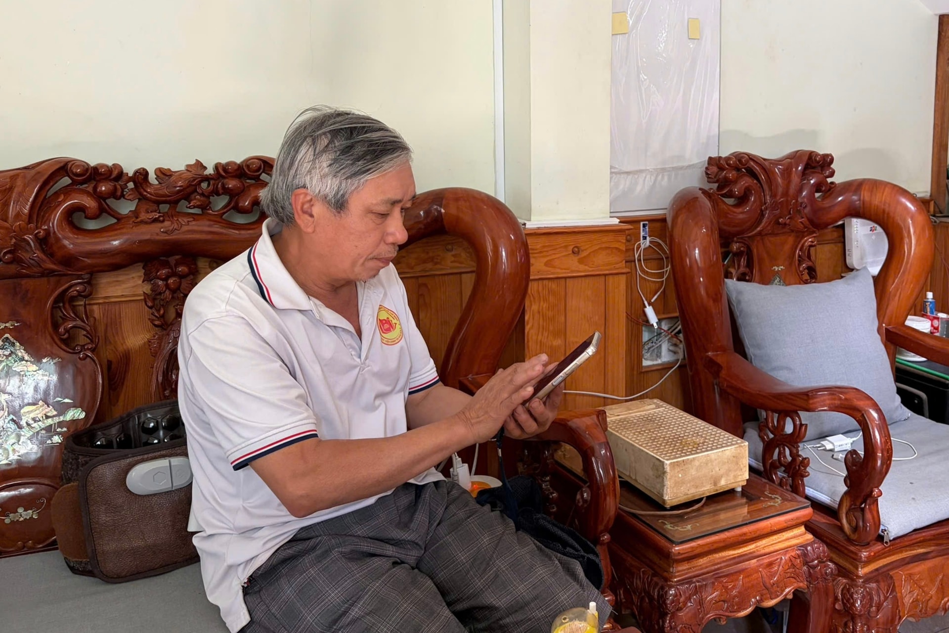 Các thông tin về Đại hội XIV của Đảng được ông Trần Văn Vân, cán bộ hưu trí tại phường Lâm Viên - Đà Lạt, tỉnh Lâm Đồng theo dõi, tìm hiểu trên tivi, điện thoại. Ảnh: Chính Thành