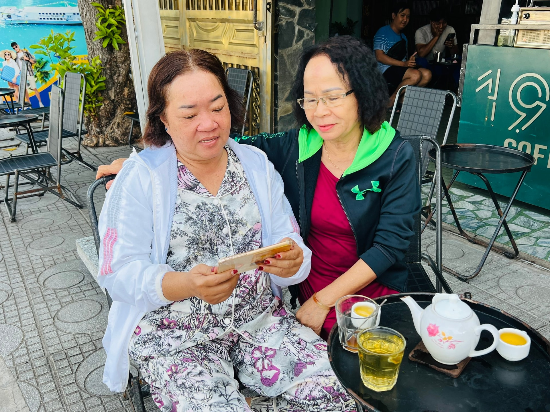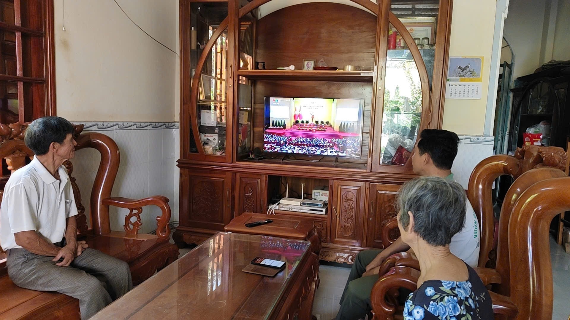 Sáng nay, Tổ tiết kiệm và vay vốn Ngân hàng Chính sách xã hội ở Đặc khu Phú Quý có cuộc họp, thế nhưng các thành viên vẫn tranh thủ theo dõi phiên khai mạc của Đại hội trong tâm thế vui tươi, phấn khởi. Ảnh: Thanh Nhàn