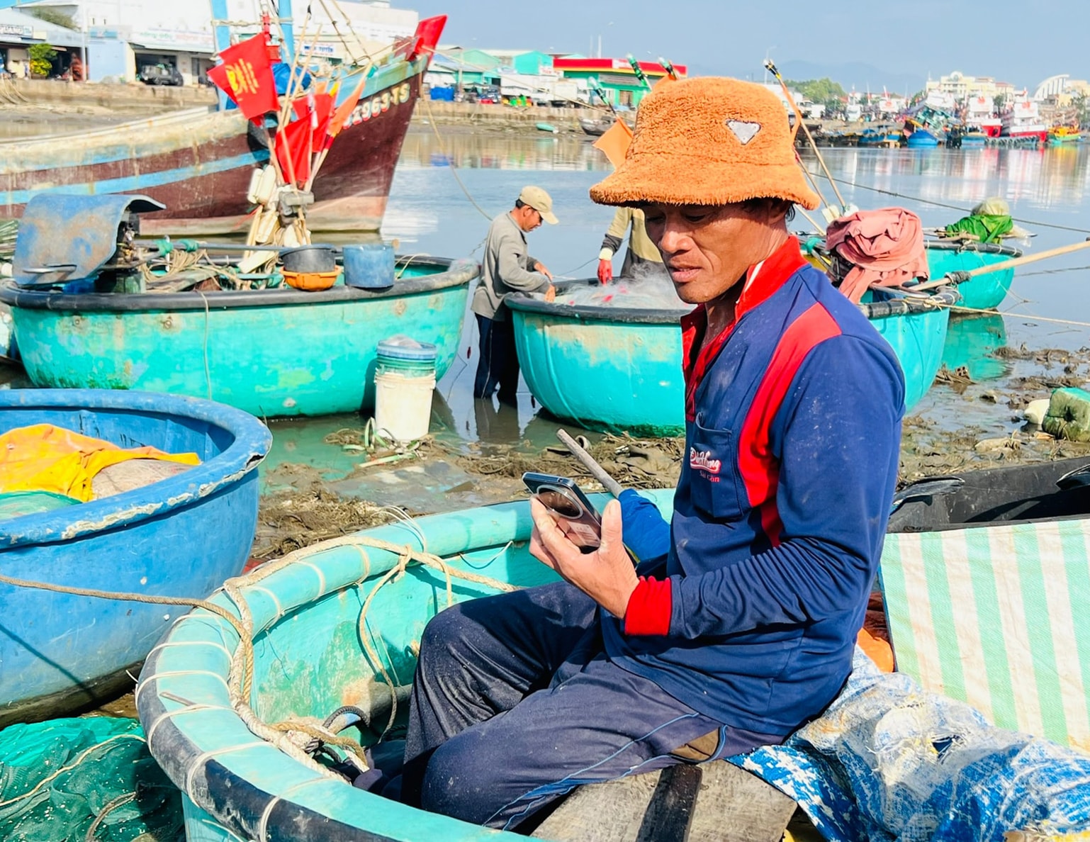 Vì háo hức, anh Nguyễn Anh Tuấn, ngư dân phường Phan Thiết theo dõi phiên khai mạc Đại hội XIV của Đảng thông qua chiếc điện thoại của mình. Ảnh: Thanh Nhàn