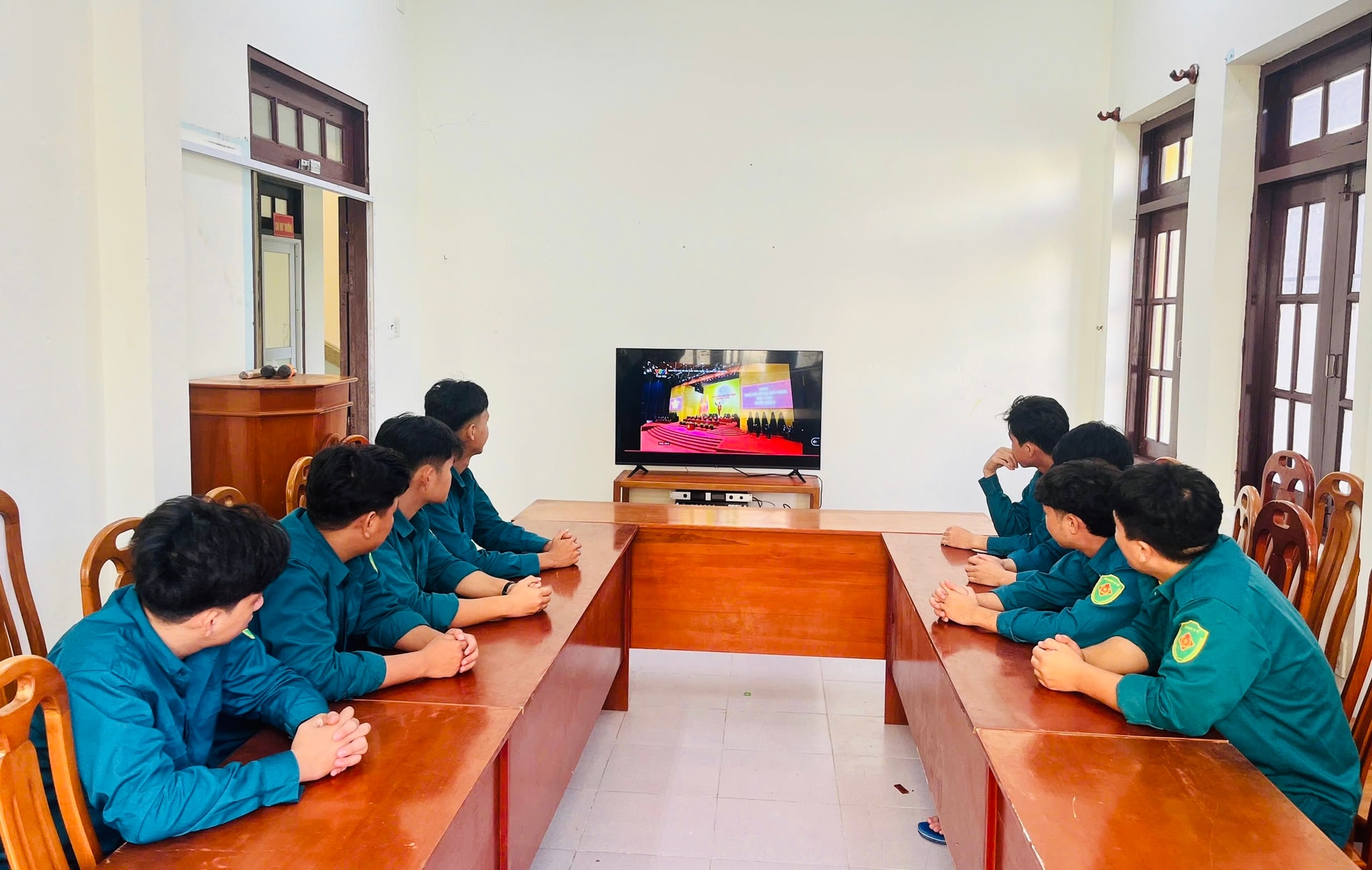 Lực lượng dân quân tự vệ của ở Đặc khu Phú Quý tổ chức theo dõi phiên khai mạc Đại hội XIV của Đảng. Ảnh: Thanh Nhàn