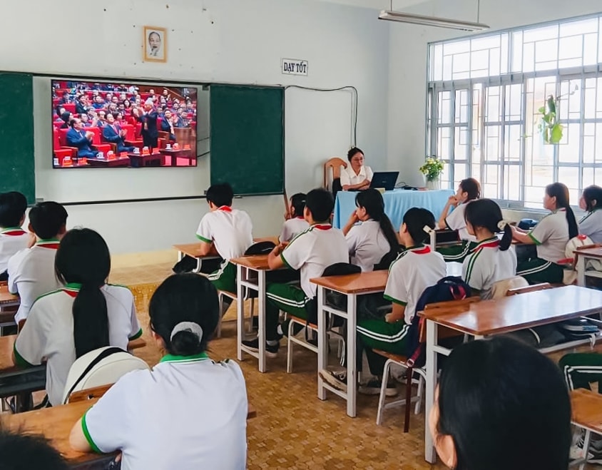 Nhiều trường học ở xã Sơn Mỹ đã tổ chức cho các em học sinh theo dõi sự kiện quan trọng của đất nước. Ảnh: Thanh Nhàn