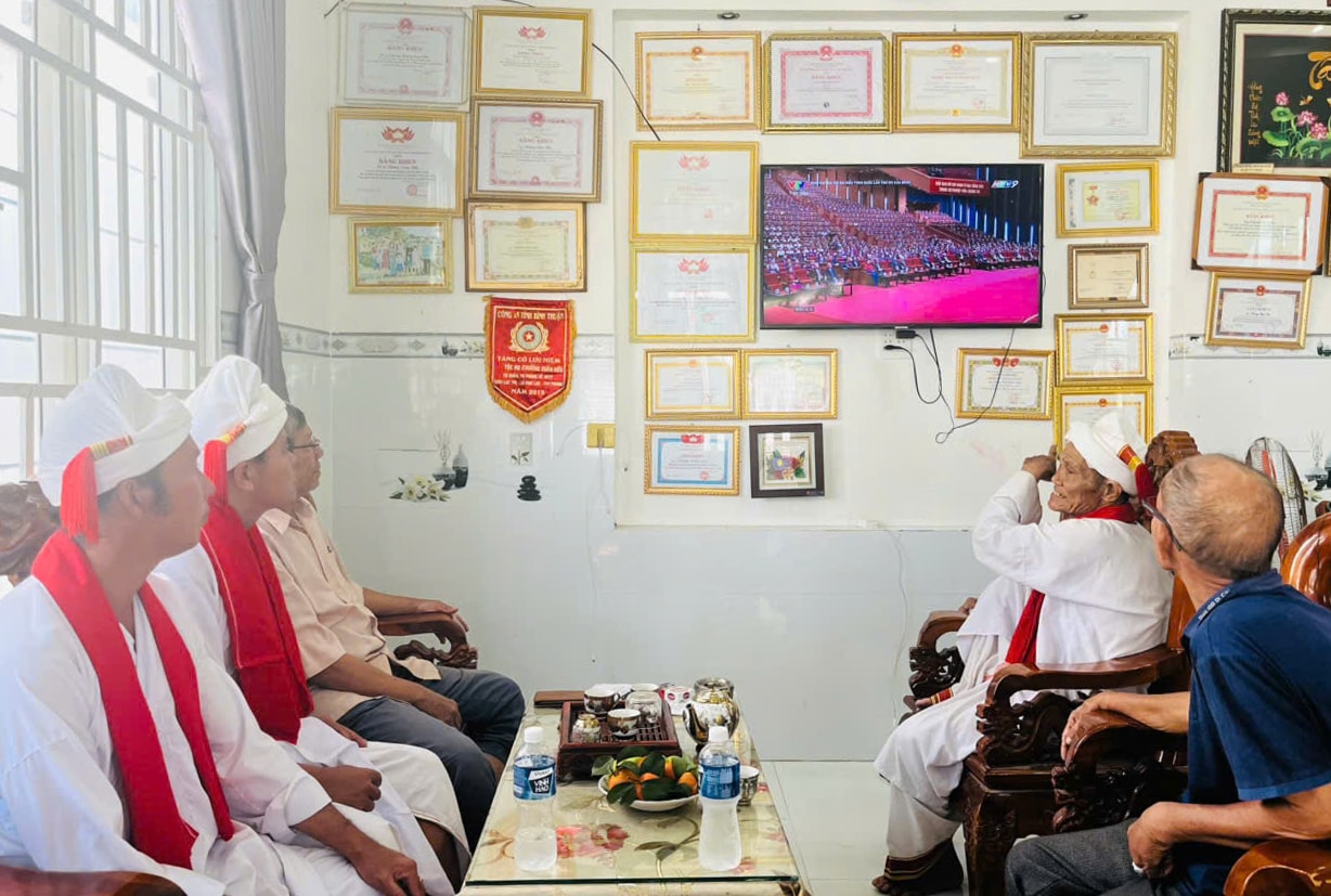 Sư cả Thường Xuân Hữu (người chỉ tay vào màn hình) và các vị chức sắc, đồng bào người Chăm thôn Lạc Trị, xã Liên Hương đang xem trực tiếp Đại hội XIV của Đảng qua sóng truyền hình. Ảnh: Thanh Nhàn