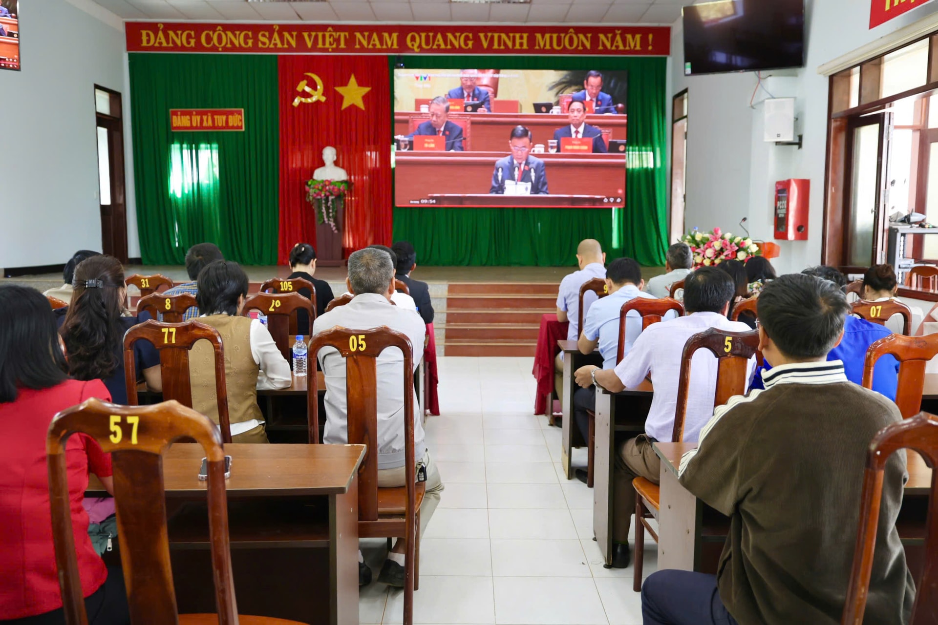 Đảng ủy, chính quyền và Nhân dân xã biên giới Tuy Đức theo dõi khai mạc Đại hội. Ảnh: Hoàng Dương