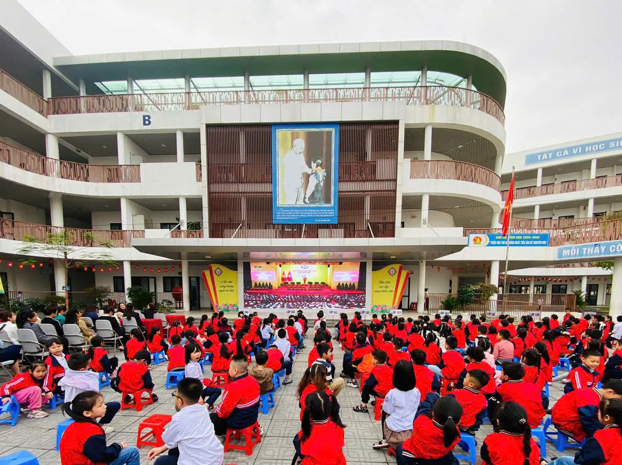 Các trường học được bố trí màn hình lớn để thầy, trò theo dõi phiên khai mạc. Ảnh LN