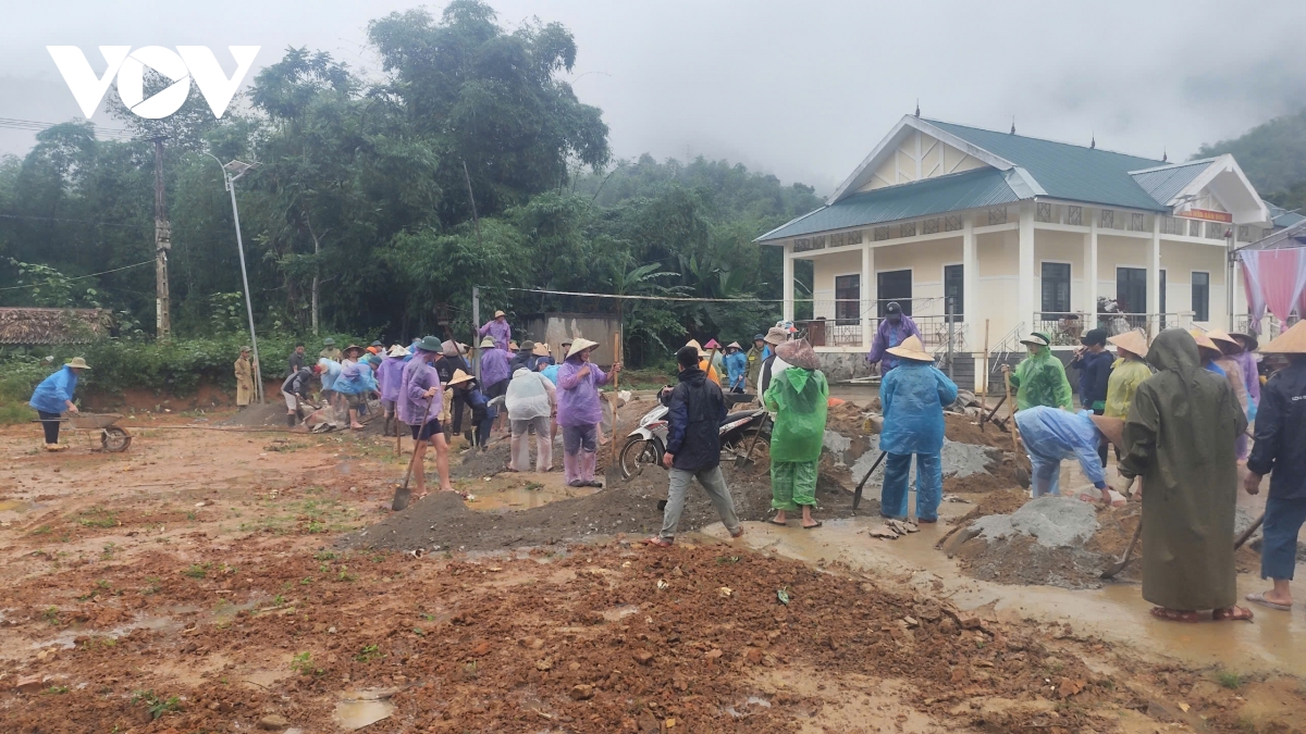 Cán bộ xã Mường Mìn tích cực hỗ trợ người dân làm nhà văn hóa.