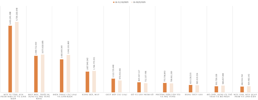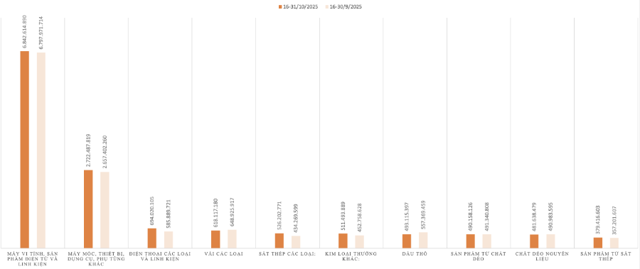 Ở chiều ngược lại, tổng kim ngạch nhập khẩu hàng hóa trong nửa cuối tháng 10 đạt 20,71 tỷ USD, tăng mạnh 4,21% (tương đương 835,8 triệu USD) so với cuối tháng 9/2025.
