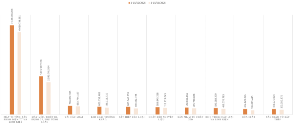 Trong nửa đầu tháng 12/2025, dệt, may; cà phê và hàng công nghệ cao là 3 nhóm hàng ghi nhận tổng trị giá xuất khẩu đạt trên 1 tỷ USD. Ngoài ra, trị giá xuất khẩu của mặt hàng giày dép cũng đạt 1,07 tỷ USD, tăng nhẹ 4,52% và điện thoại các loại và linh kiện đạt 1,96 tỷ USD nhưng giảm 9,095 so với cùng kỳ tháng trước.