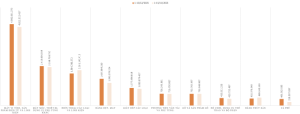 Ngoài ra, 9 nhóm hàng khác cũng ghi nhận mức tăng trên 1 tỷ USD bao gồm: máy móc, thiết bị, dụng cụ phụ tùng khác; đồ chơi, dụng cụ thể thao và bộ phận; cà phê; hàng dệt may; điện thoại các loại và linh kiện; phương tiện vận tải và phụ tùng; giày dép các loại; hàng thủy sản và hàng rau quả.