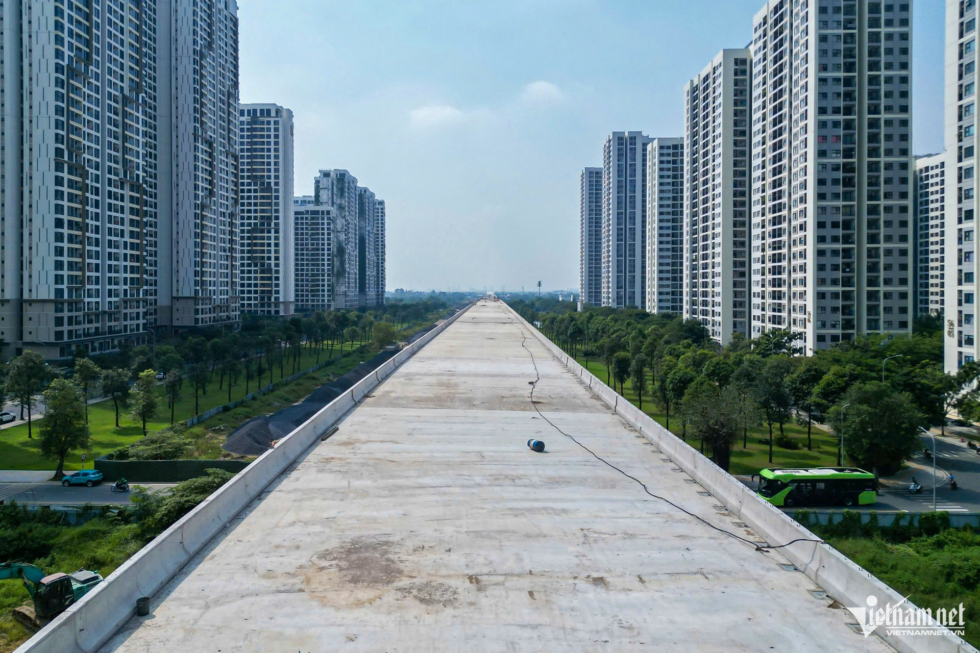 Đoạn từ khu đô thị Vinhomes Grand Park kéo dài đến gói thầu XL2, công tác hoàn thiện lan can, dải phân cách và các hạng mục hạ tầng phụ trợ đang được triển khai đồng loạt.