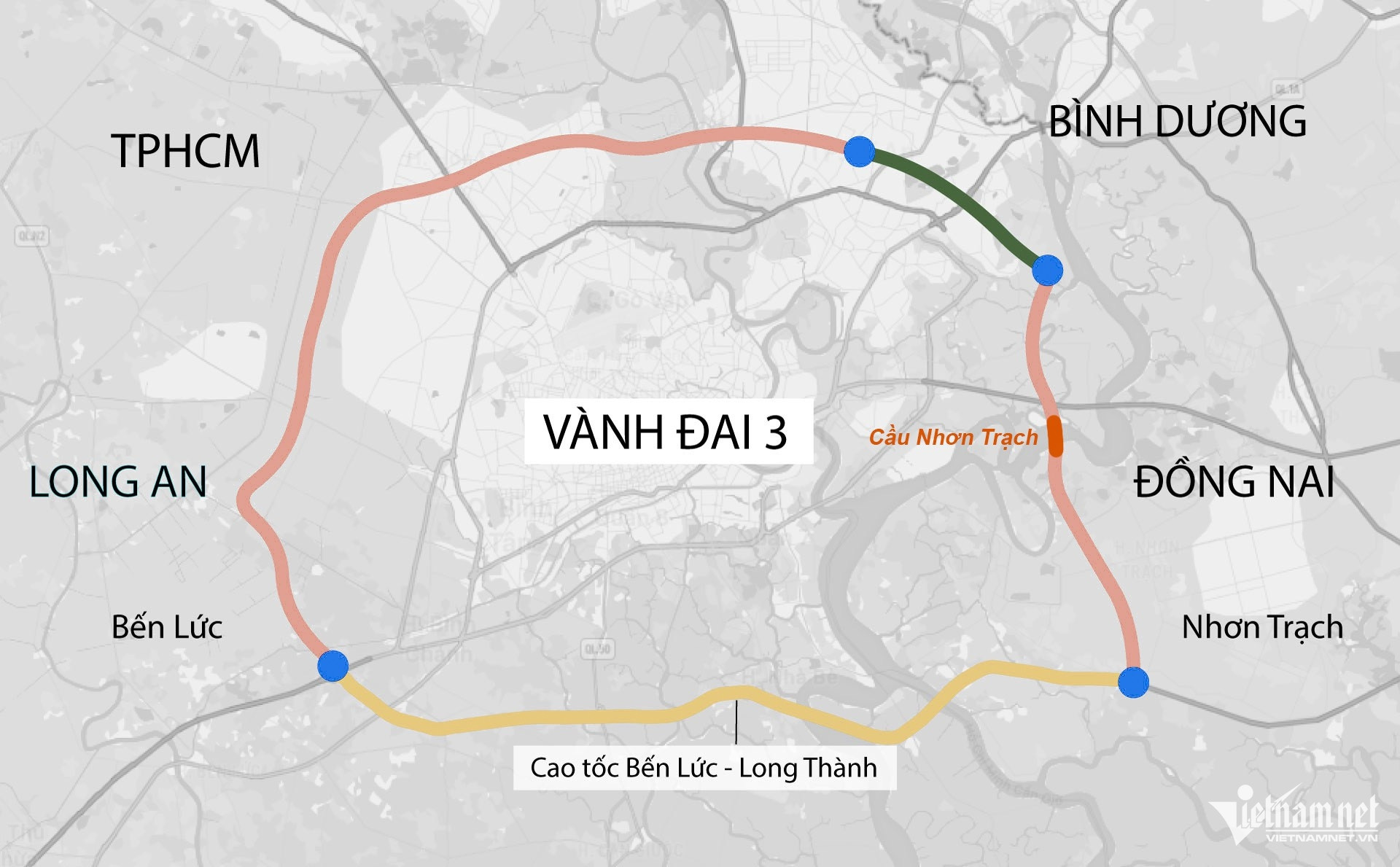 Tại công trường nút giao Vành đai 3 với cao tốc TPHCM - Long Thành, Ban Giao thông TPHCM vẫn đang hoàn thiện các nhánh rẽ để đấu nối dự án thành phần 1A (cầu Nhơn Trạch) với dự án thành phần 1. Hiện, nút giao này mới chỉ vận hành một nhánh rẽ kết nối cao tốc TPHCM - Long Thành với cầu Nhơn Trạch.