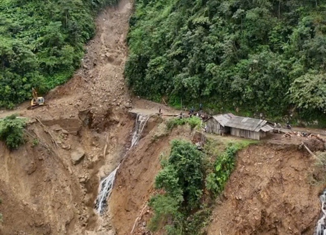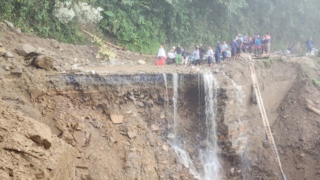 Lực lượng chức năng đang nỗ lực mở đường tạm bằng cách dẫn dòng nước chảy sang mương bên cạnh, sau đó sẽ gia cố rọ đá để khôi phục tuyến cho người dân đi lại.