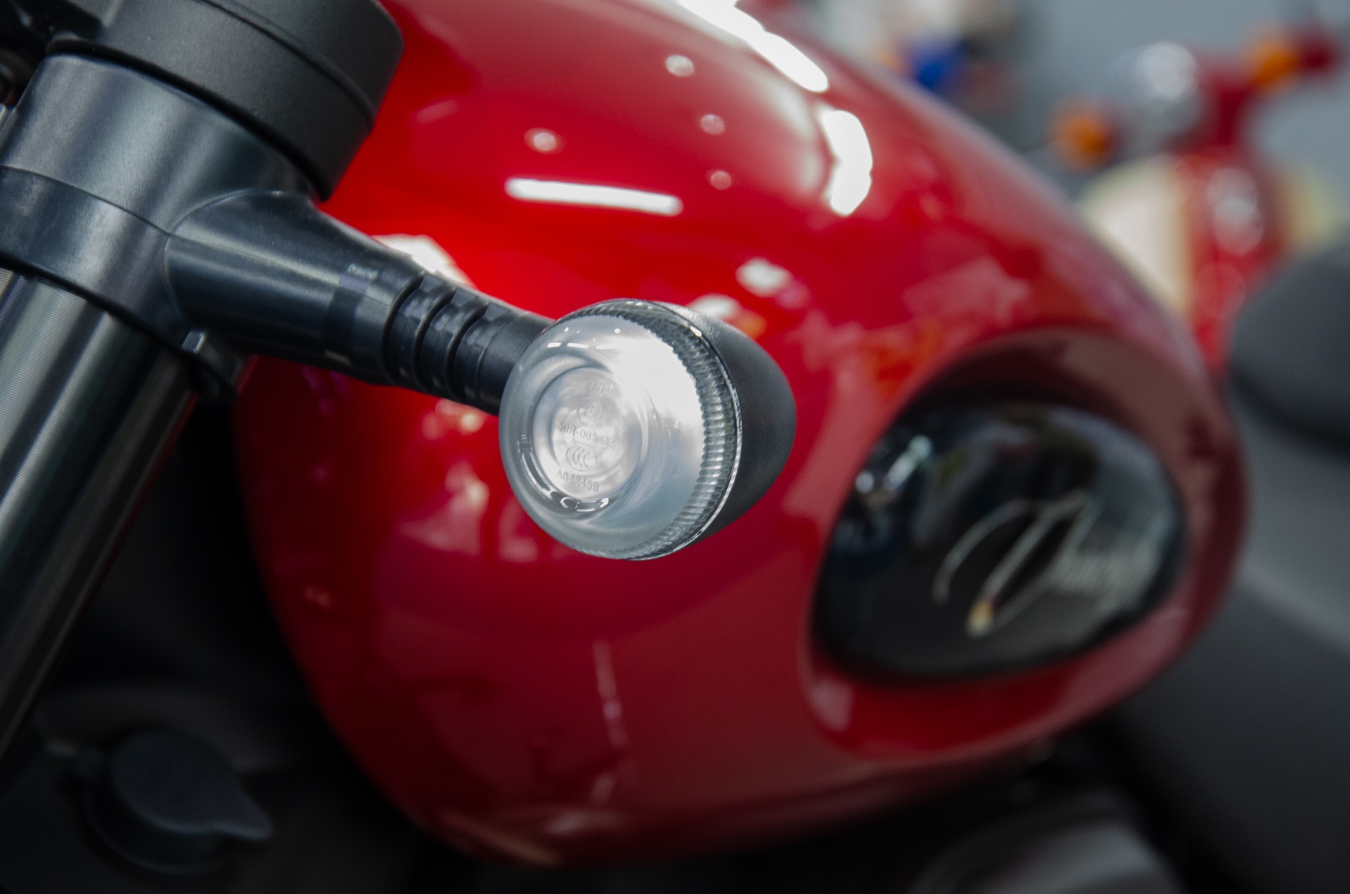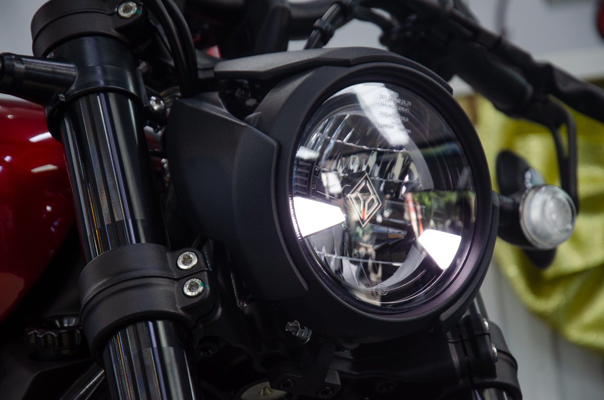 Cụm đèn chiếu sáng full LED hình tròn có khắc logo thương hiệu Benda bên trong. Mẫu cruiser Trung Quốc trang bị đèn xi-nhan đặt rời.