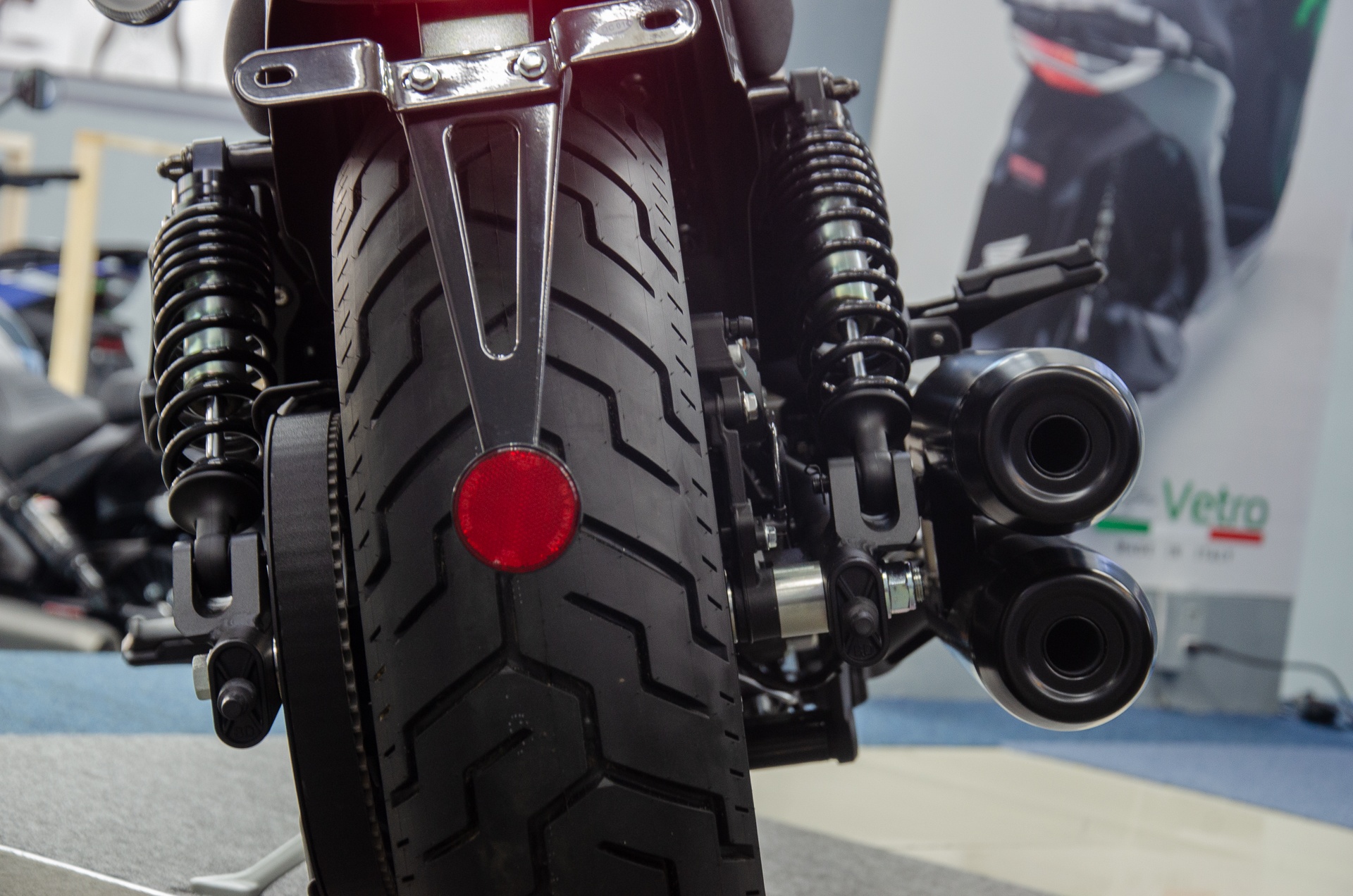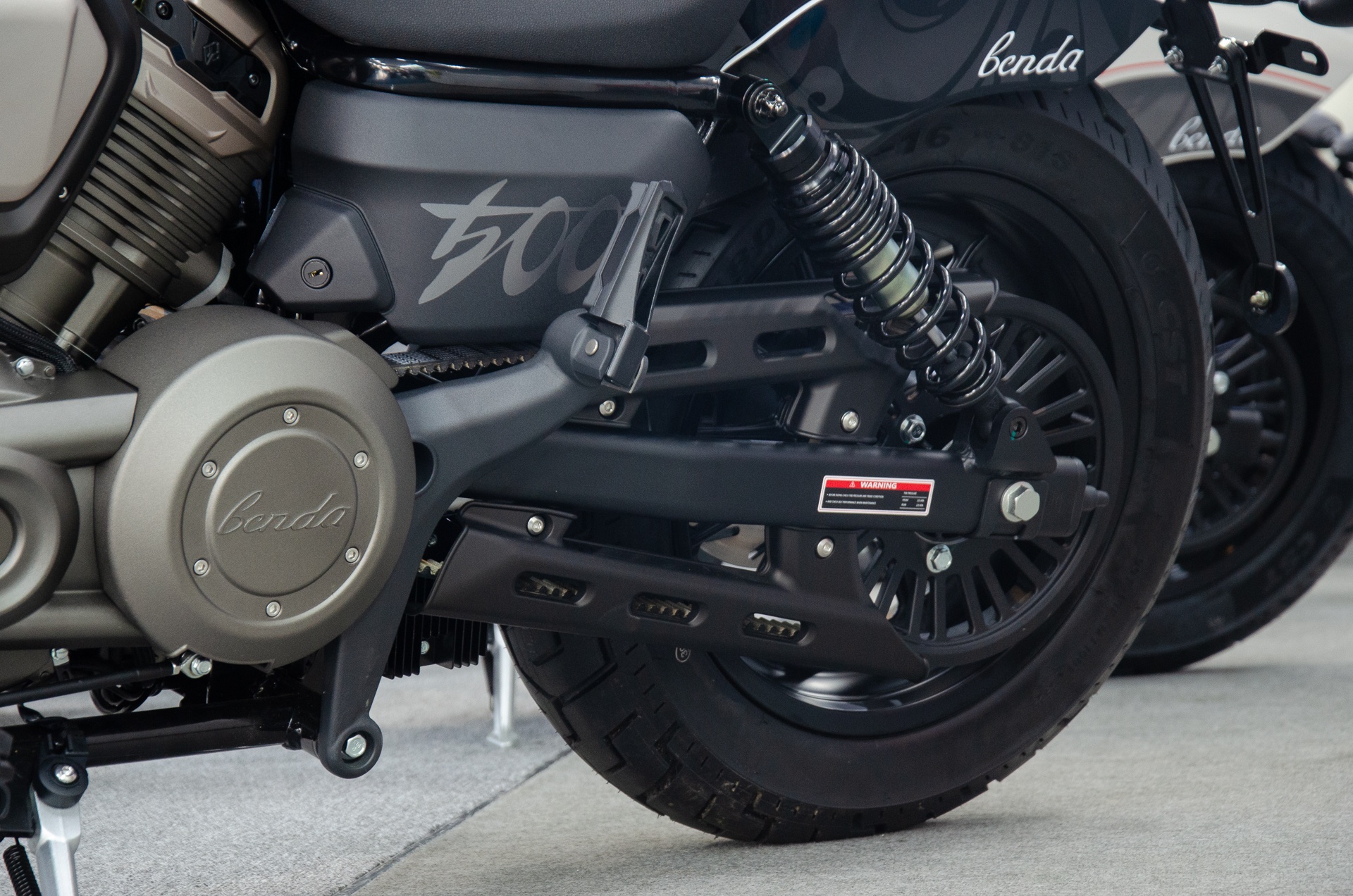 Cận cảnh ống xả đôi xếp chồng trên Benda Chinchilla 500. Theo thông tin từ hãng, mẫu cruiser sở hữu mức tiêu thụ nhiên liệu khoảng 4,5 lít/100 km.