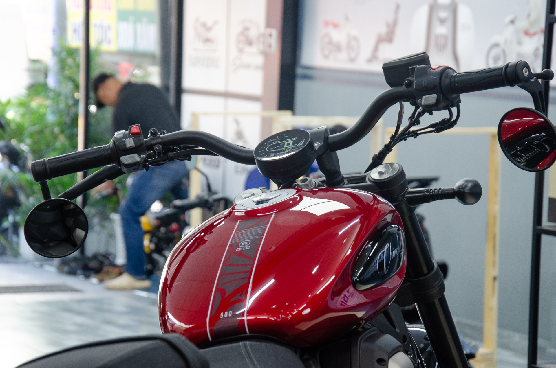 Mẫu cruiser thương hiệu Trung Quốc được trang bị ghi đông cung cấp tư thế lái thoải mái. Gương chiếu hậu hình tròn, gắn xuống phía dưới tay lái.