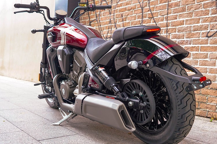 Thân xe kết hợp chi tiết kim loại chạy từ phía trên bình nối liền với khung nâng đỡ yên xe, tạo sự liền lạc, thanh thoát. Chiếc môtô cruiser Benda Dark Flag 500 Commander V4 này có chiều dài hơn 2.300 mm cùng chiều dài cơ cơ gần 1.600 mm và có trong lượng tới 260 kg.