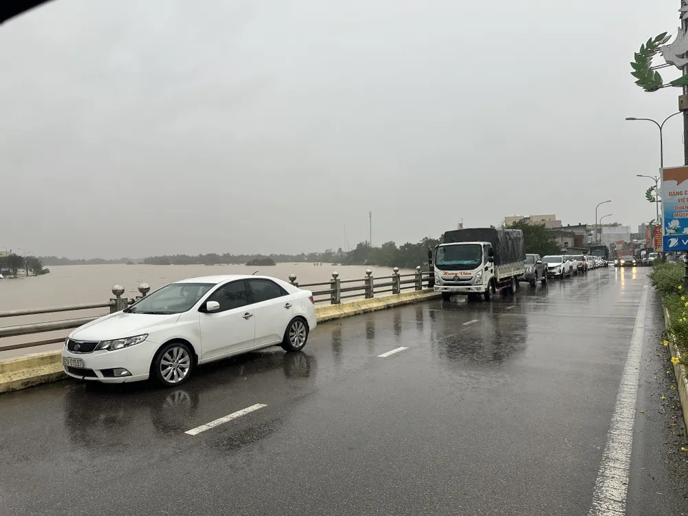 Dự báo lũ tiếp tục dâng, người dân đưa hàng trăm ô tô, xe máy lên cầu Ái Nghĩa trú ẩn. Tuy nhiên, đến trưa nay, các lực lượng của xã đến vận động, đề nghị người dân đưa xe đến chỗ cao hơn nhằm đảm bảo an toàn tuyệt đối.