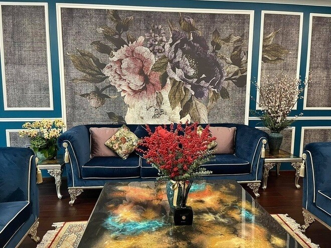 Phòng khách nổi bật với bộ bàn ghế xa hoa, rèm cửa màu vàng. Ảnh: FBNV